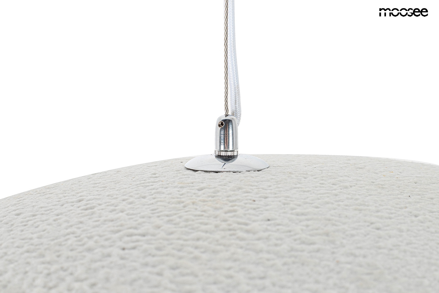 - MOOSEE lampa wisząca NEST 120 biała. Lampa inspirowana kulistym obłokiem, przeznaczona dla miłośników designu. Nieregularny kształt wykonany z żywicy swoją strukturą przypomina kamień. Zawieszona na białym przewodzie, unosząc się, wprowadza w melancholijn