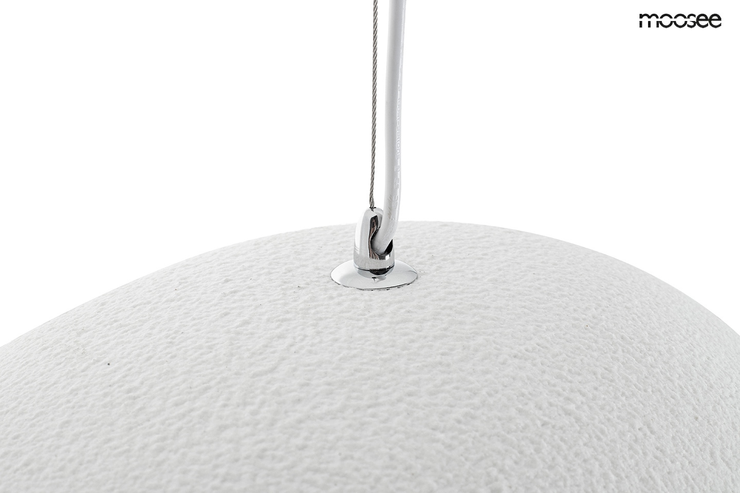 - MOOSEE lampa wisząca NEST 60 biała. Lampa inspirowana kulistym obłokiem, przeznaczona dla miłośników designu. Nieregularny kształt wykonany z żywicy swoją strukturą przypomina kamień. Zawieszona na białym przewodzie, unosząc się, wprowadza w melancholijny