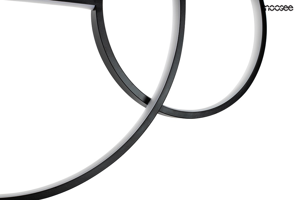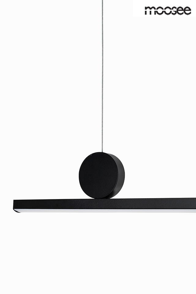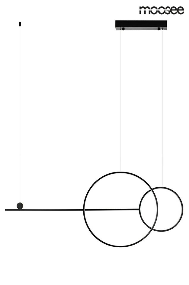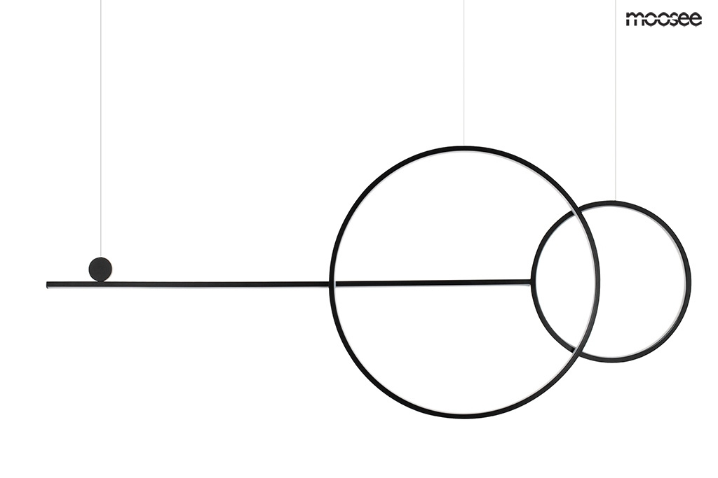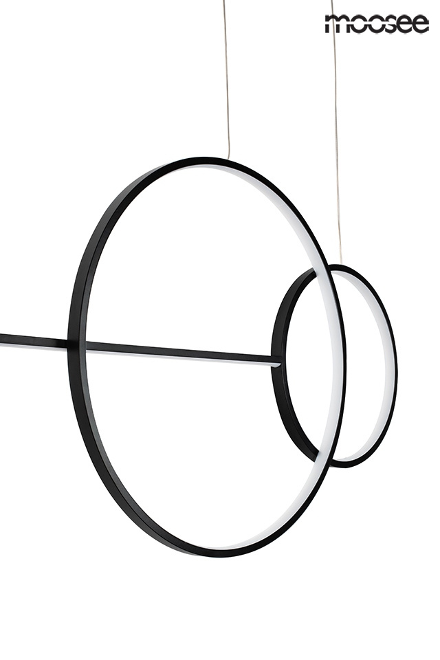 - MOOSEE lampa wisząca RAGE czarna. Nowoczesna lampa została wykonana z metalu i aluminium w kolorze czarnym. Lekka podłużna konstrukcja z dekoracyjnymi okręgami będącymi częścią oświetlenia. Dzięki zastosowaniu modułu ledowego w każdym elemencie lampy, świ
