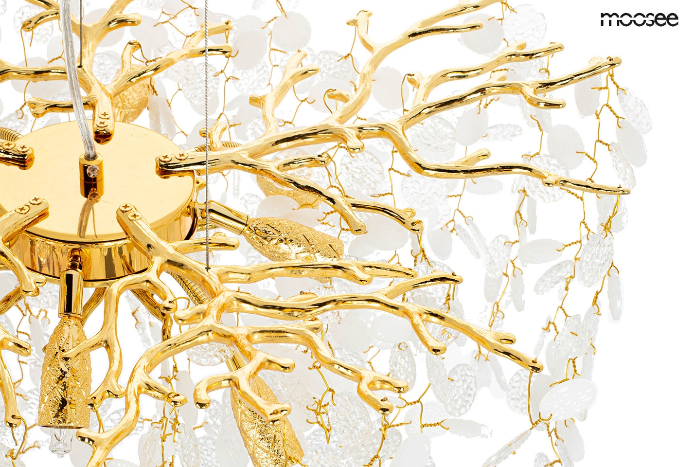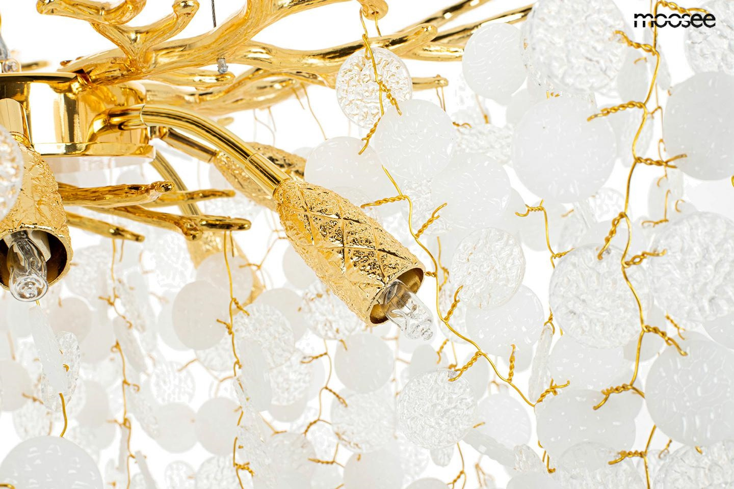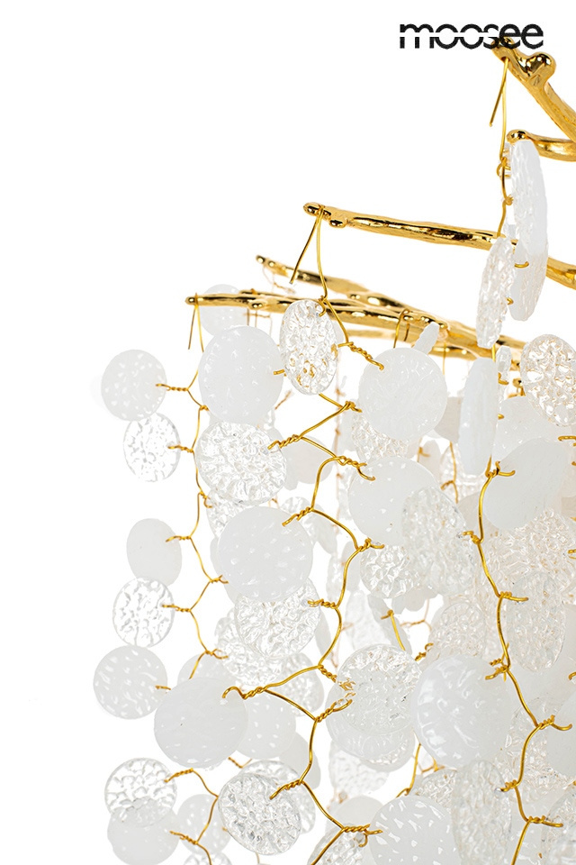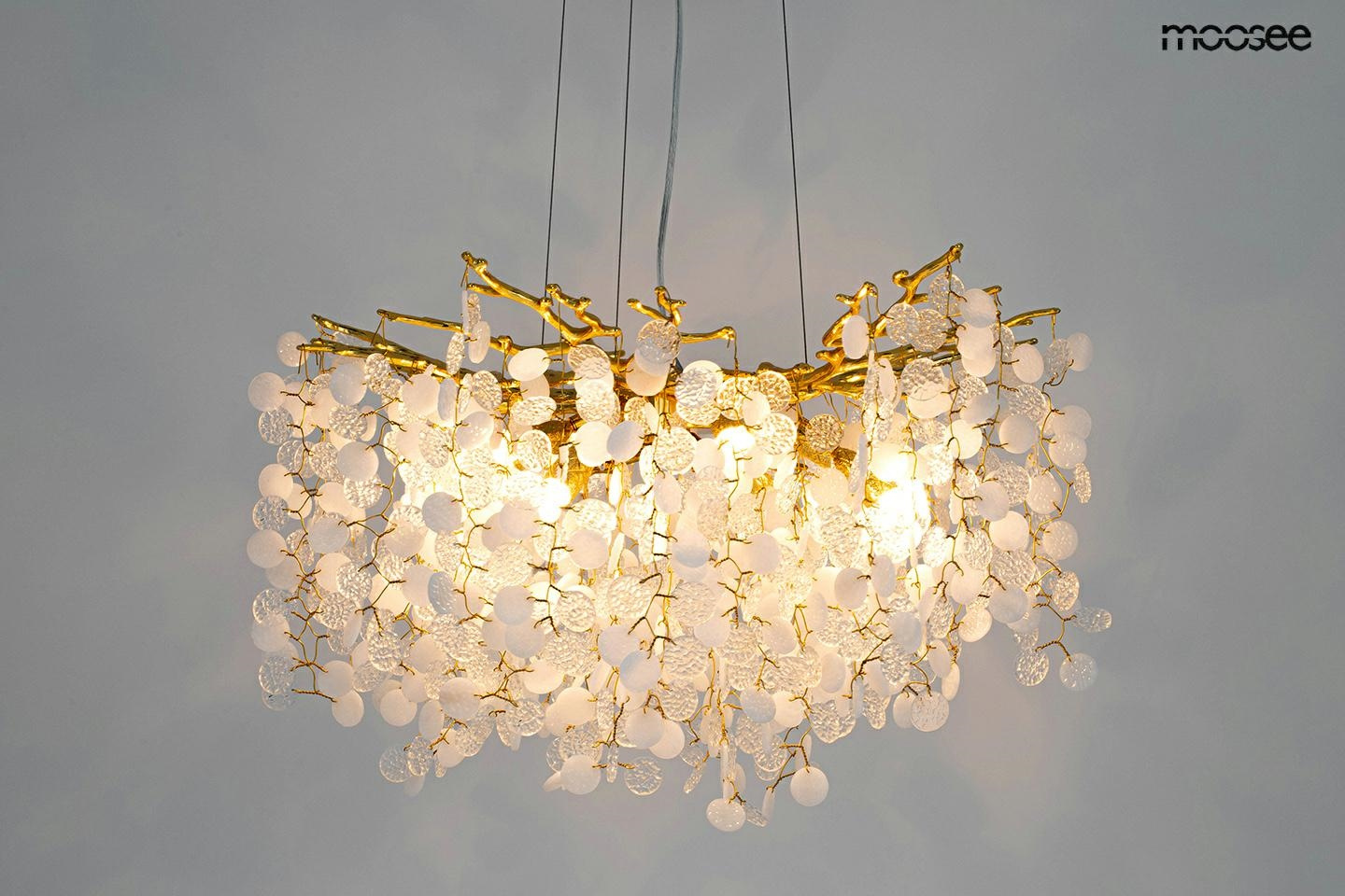 - MOOSEE lampa wisząca RIVIERA 60 złota. Ekskluzywna i niecodzienna oprawa, która udekoruje Twoje wnętrze. Zbiór wykonanych z pełną precyzją akrylowych kloszy zamontowano na stalowej obręczy w kolorze złotym, imitującej gałęzie drzewa. Wśród kloszy ukryto a
