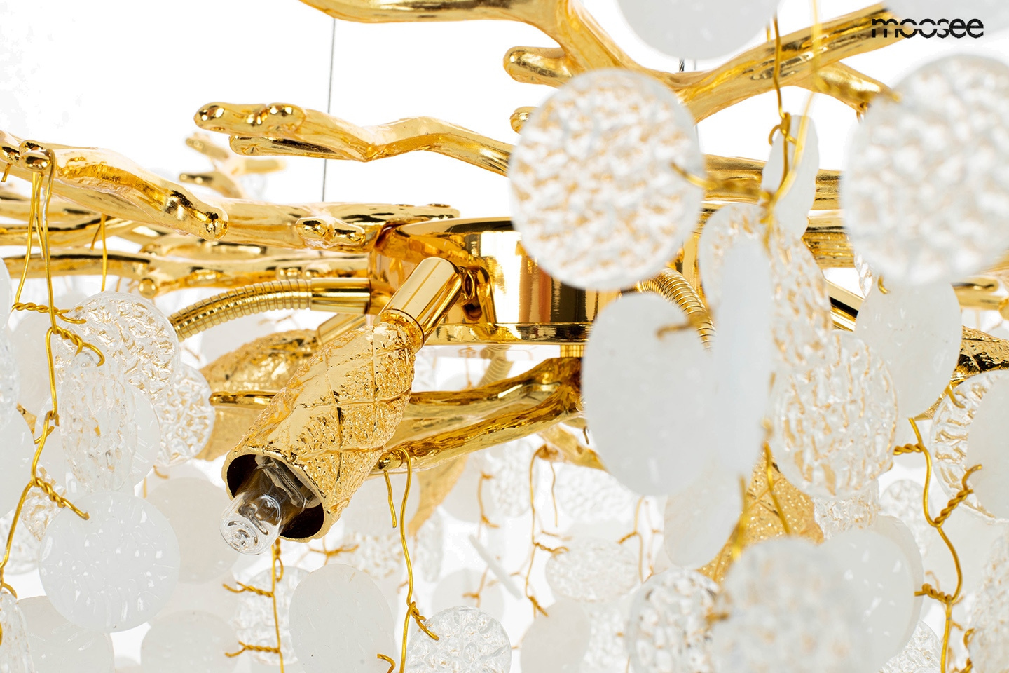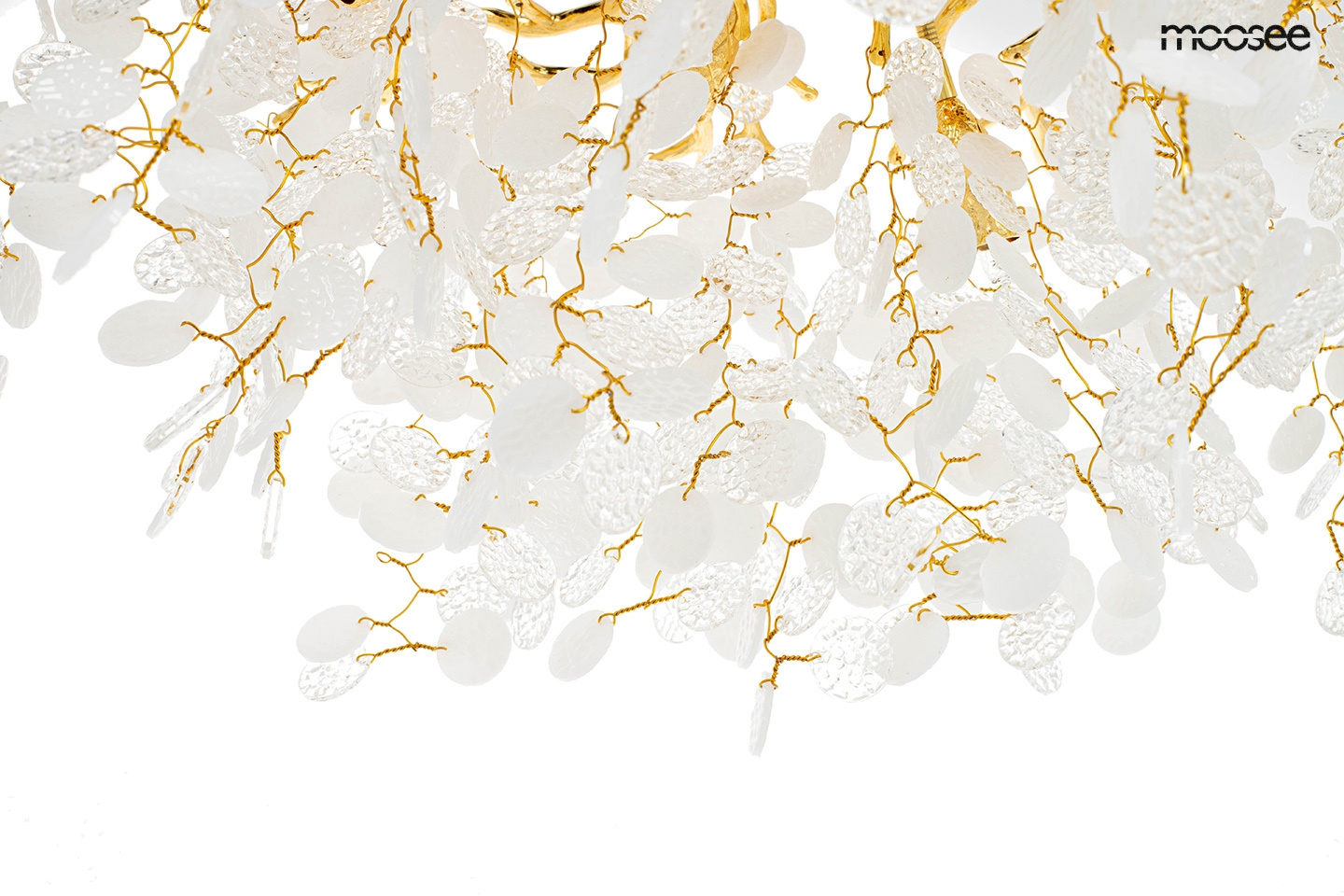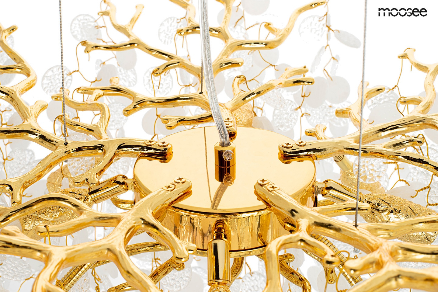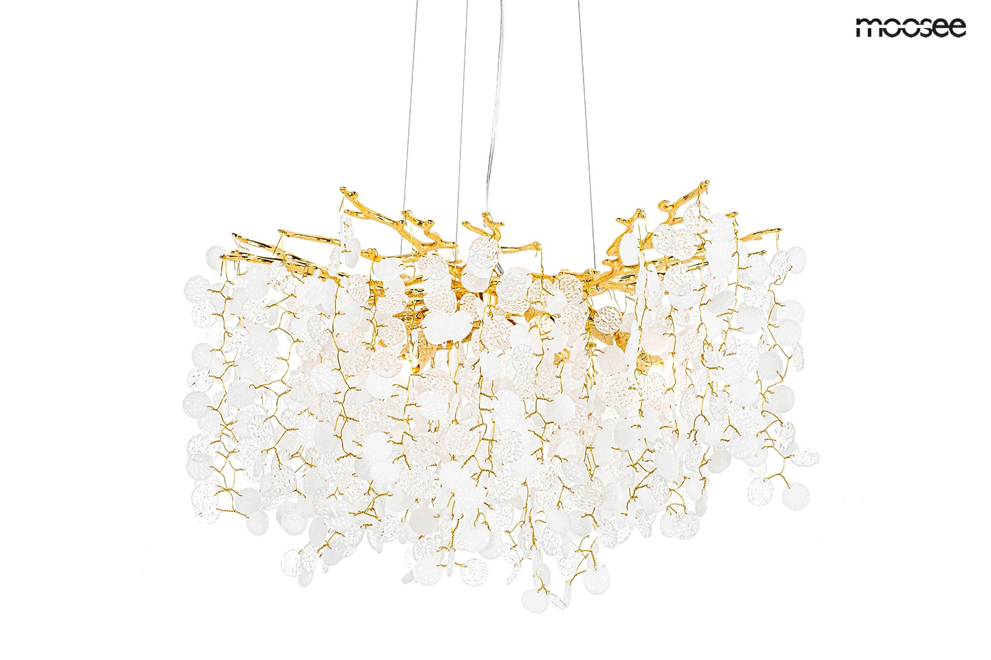 - MOOSEE lampa wisząca RIVIERA 60 złota. Ekskluzywna i niecodzienna oprawa, która udekoruje Twoje wnętrze. Zbiór wykonanych z pełną precyzją akrylowych kloszy zamontowano na stalowej obręczy w kolorze złotym, imitującej gałęzie drzewa. Wśród kloszy ukryto a