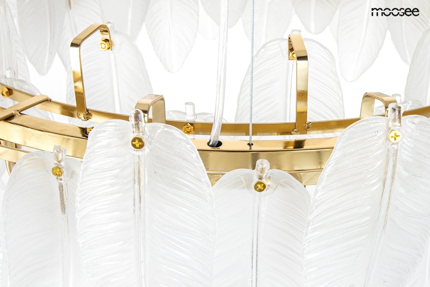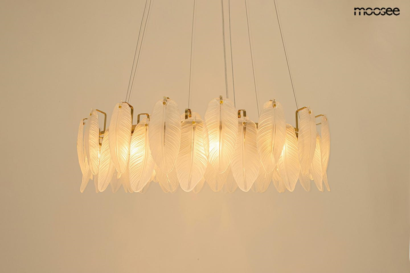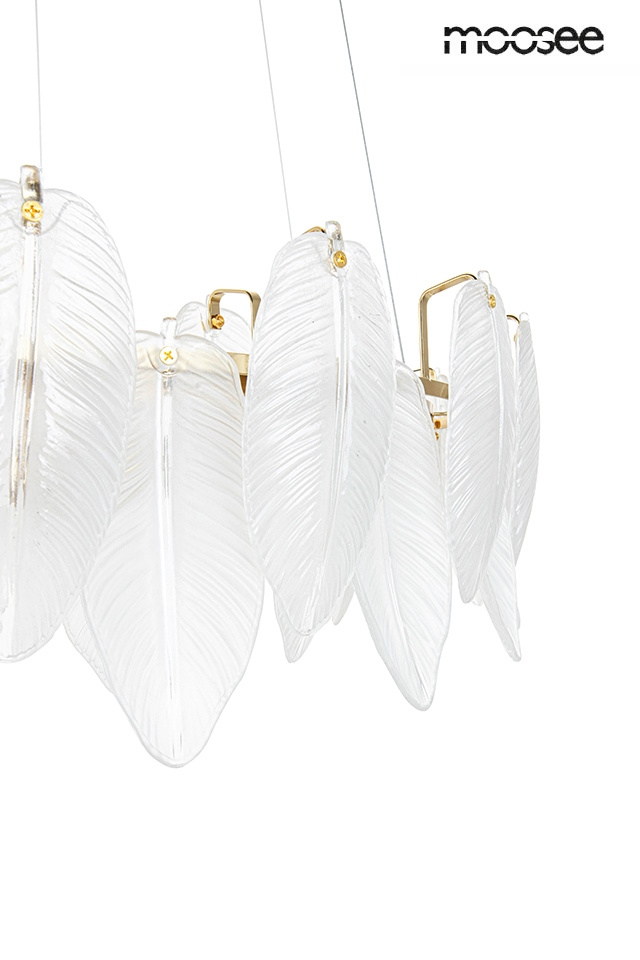 - MOOSEE lampa wisząca ROCH 60 złota. Niezwykle elegancka propozycja oświetlenia, które zachwyca swoim wyrafinowanym designem. Subtelnego uroku dodają mleczne szklane klosze przypominające liście. Całość umieszczono na eleganckim stelażu wykończonym w złoty