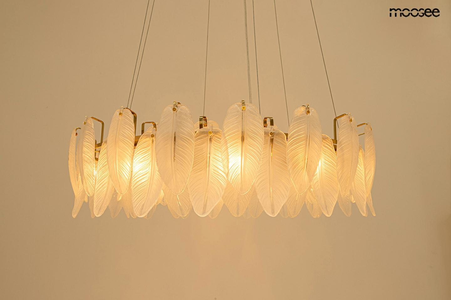 - MOOSEE lampa wisząca ROCH 80 złota. Niezwykle elegancka propozycja oświetlenia, które zachwyca swoim wyrafinowanym designem. Subtelnego uroku dodają mleczne szklane klosze przypominające liście. Całość umieszczono na eleganckim stelażu wykończonym w złoty