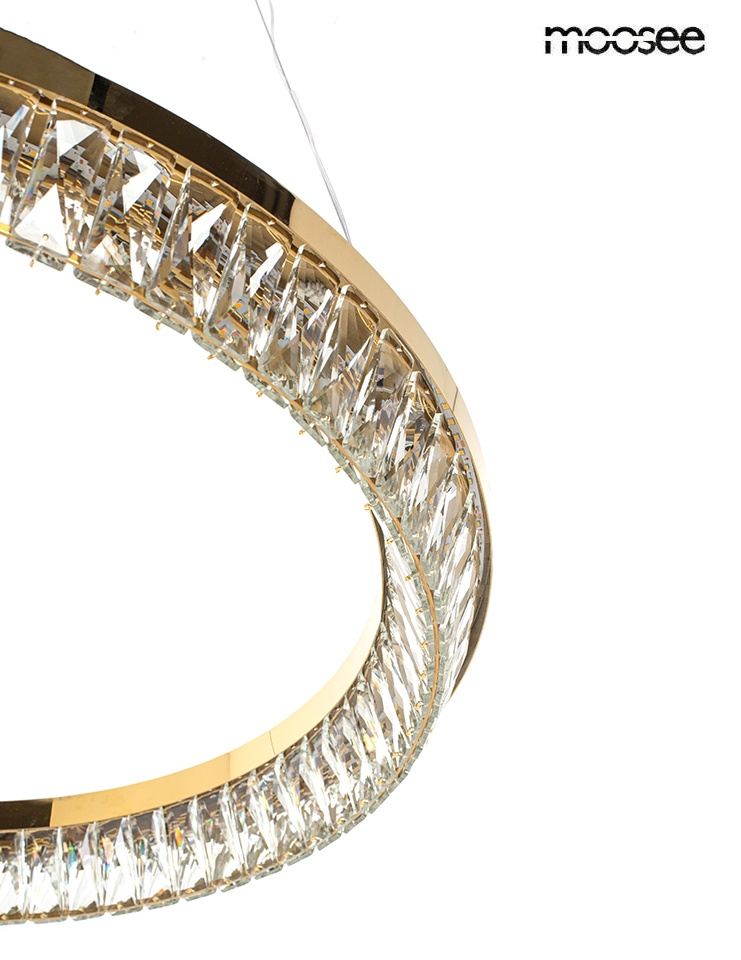 - MOOSEE lampa wisząca SAVOY 100 złota. Kolekcja Savoy to elegancka i luksusowa seria oświetlenia, która zachwyca wyrafinowanym stylem i precyzyjnym wykonaniem. Charakteryzuje się połączeniem złotego metalu i przezroczystych kryształów, tworzących spektakul