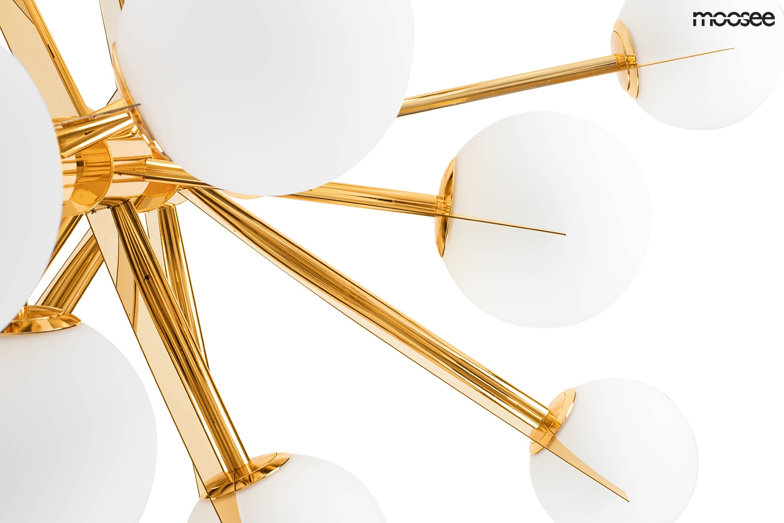 - MOOSEE lampa wisząca SOLEI złota. Metalowa konstrukcja, stożkowa podsufitka i 18 szklanych kloszy tworzy niezwykle nowoczesną oprawę. Ozdobna forma, połączenie koloru złotego z mlecznymi kloszami nadaje jej szyku i elegancji. Dzięki zastosowaniu gwintu G9