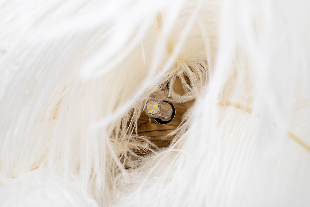 - Lampa wisząca TIFFANY biała. Klosz tworzy 80 sztuk gęsto ułożonych, naturalnych strusich piór o długości 55-60 cm, którymi możemy regulować wysokość całkowitą oraz kształt lampy. Całość została przymocowana do podsufitki mosiężnym łańcuchem w naturalnym z