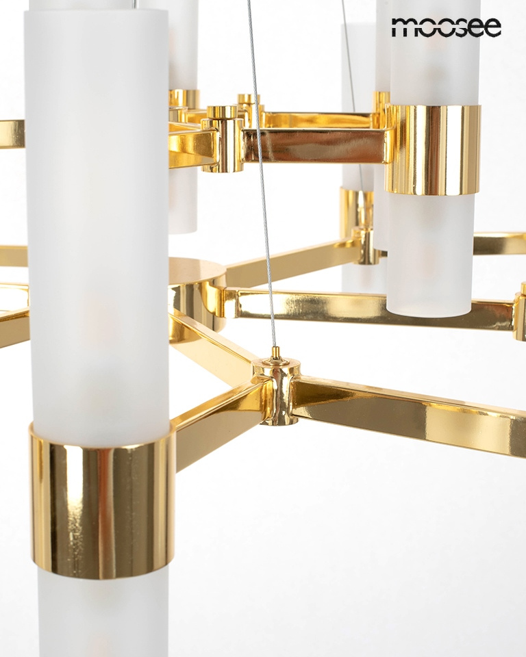 - MOOSEE lampa wisząca TUBS 18 złota. Tubs to wyrafinowane połączenie klasyki z nowoczesnym designem, prezentujące się w efektownym, bogatym złotym wykończeniu. Imponująca konstrukcja składa się z 36 eleganckich, białych szklanych kloszy, które subtelnie ro