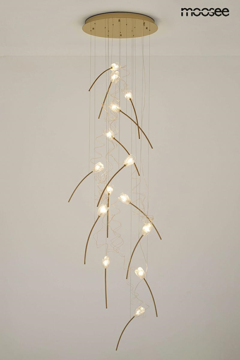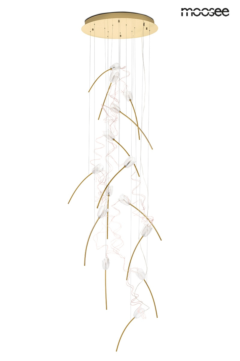 - MOOSEE lampa wisząca TULIPPE 14 DISC złota. Piękna, wyjątkowa oprawa, która nie tylko oświetli, ale i ozdobi nie jedno wnętrze. Przezroczyste, akrylowe klosze imitują kwiaty, tulipany, które w niezwykły sposób rozpraszają strumienie światła. Złote wykończ