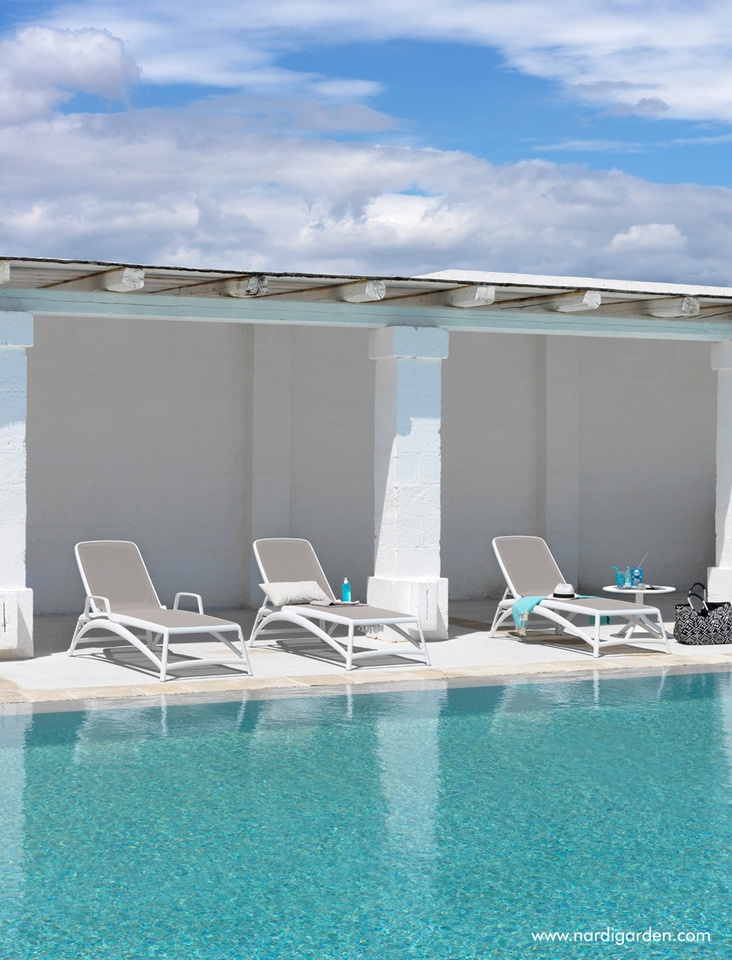 - NARDI leżak ogrodowy ATLANTICO biały / beżowy. Propozycja dla każdego, kto szuka chwili wytchnienia i stylowego wypoczynku. Wykonany z żywicy polipropylenowej z dodatkiem włókna szklanego oraz filtrami UV, cechuje się odpornością na działanie warunków atm
