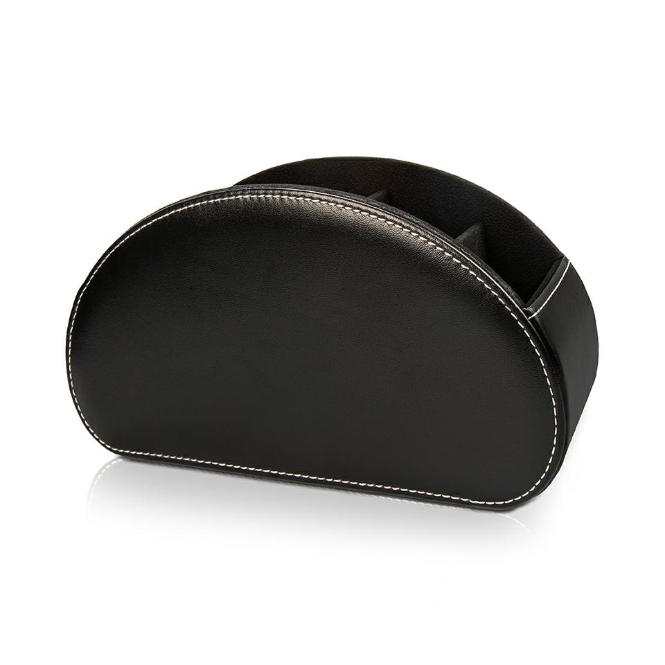Organizer na piloty REMOT. Czarny skórzany organizer na piloty to elegancki i praktyczny sposób przechowywania wszystkich pilotów do telewizji, kina domowego oraz innych sprzętów elektronicznych. Dzięki wielu przegródkom, łatwo można zorganizować i odnaleźć potrzebny pilot. Wykonany z wysokiej jakości skóry i ozdobiony białą nicią, prezentuje się niezwykle stylowo i elegancko, idealnie pasując do każdego salonu. Wymiary: wys. 11,5 cm / szer. 23,5 cm / gł. 7,5 cm.