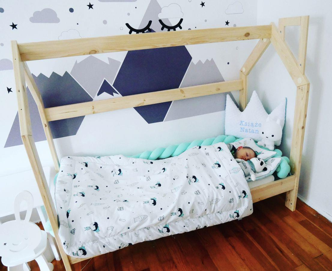 Komplet pościeli z wypełnieniem to lekka kołderka z antyalergicznym wypełnieniem oraz płaska poduszka panel, z jednej strony tkanina w drukowany wzór, z drugiej strony gładka biała, wykończone ozdobną lamówką.