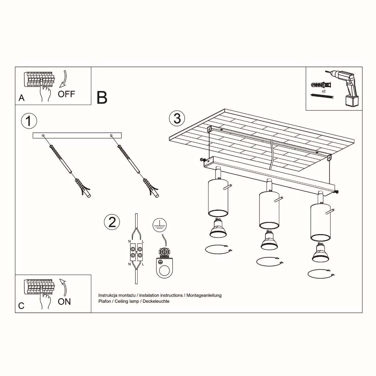 - Źródło światła: GU10, 3x max 10W LED, ~230V, 50Hz, IP20, klasa ochronności IŹródło światła nie jest w komplecie.Wymiary: 45/6/16 cmMateriał: stalKolor: szary