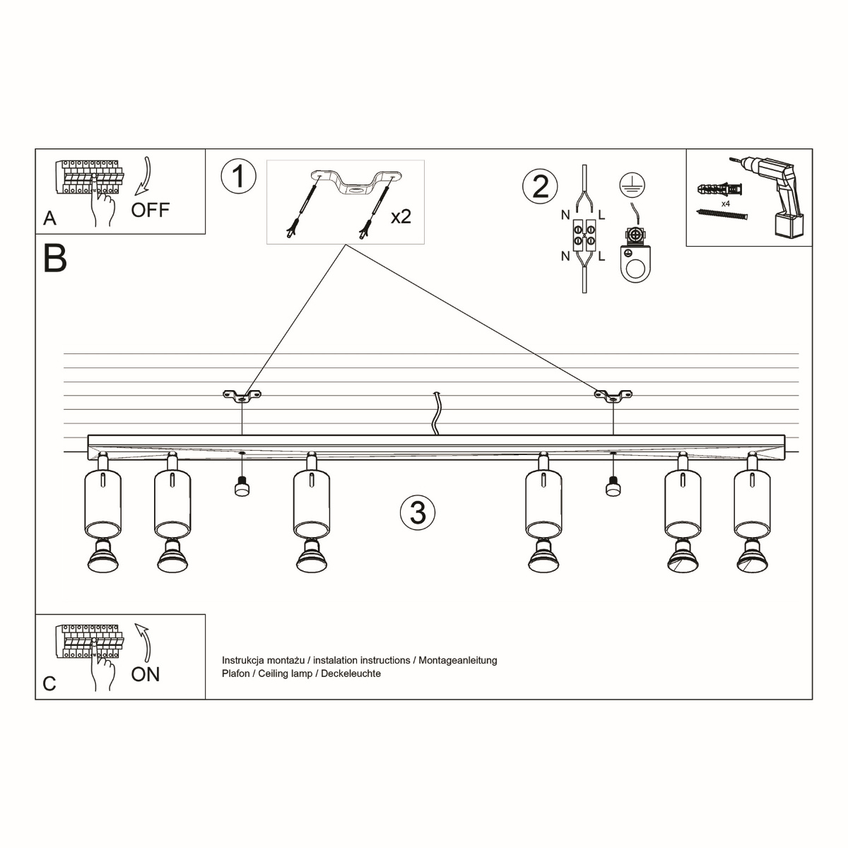 - Źródło światła: GU10, 6x max 10W LED, ~230V, 50Hz, IP20, klasa ochronności IŹródło światła nie jest w komplecie.Wymiary: 118/6/16 cmMateriał: stalKolor: szary