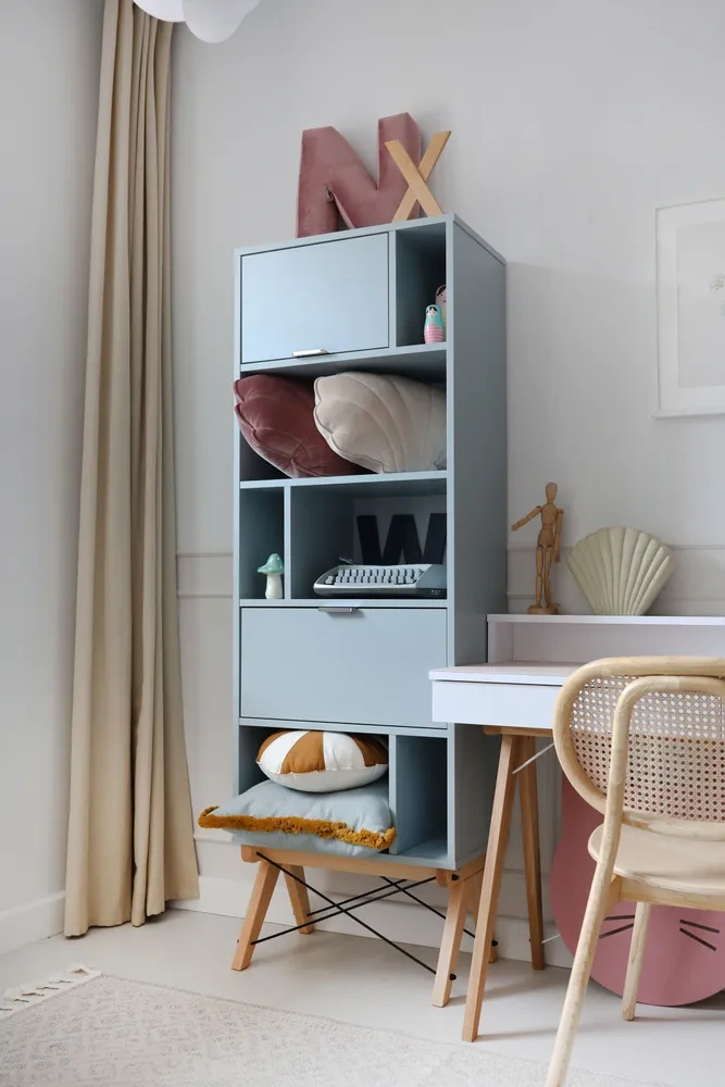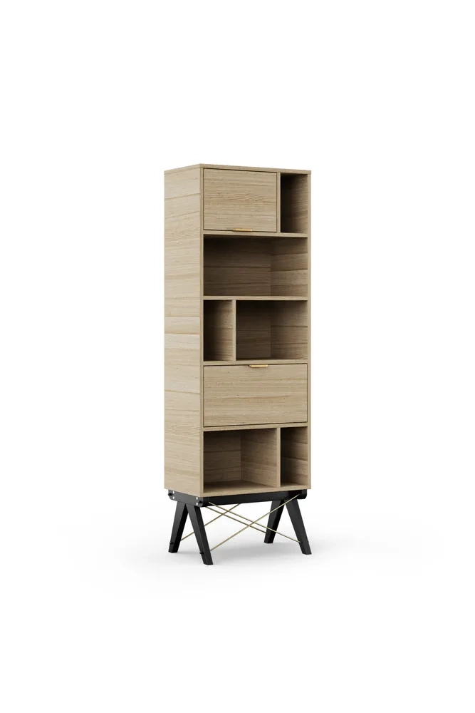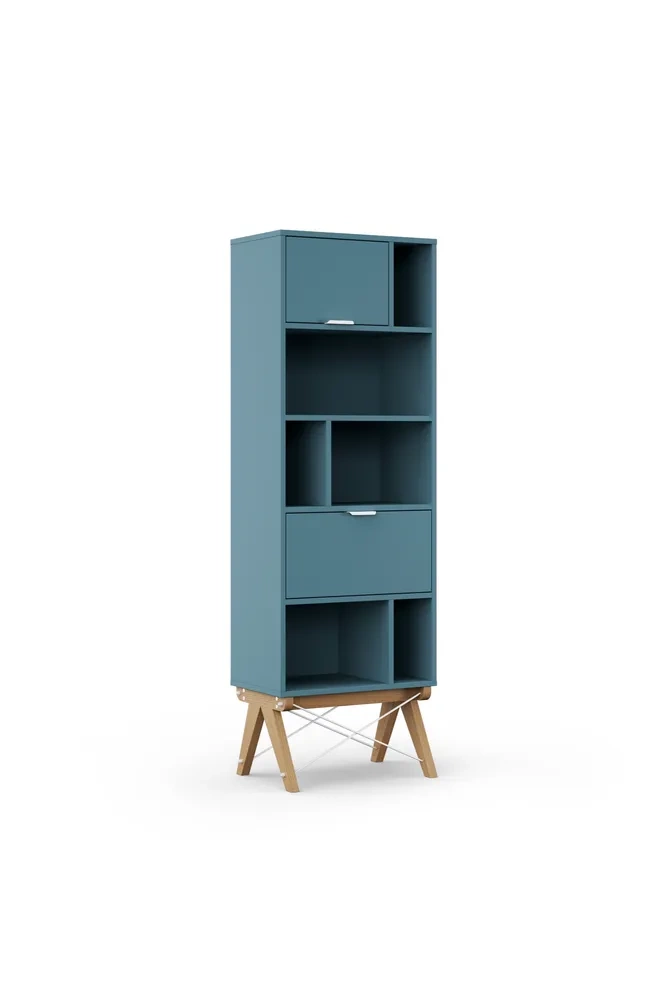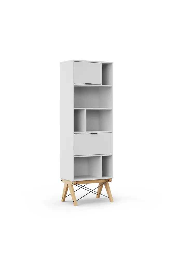Regał posiada aż osiem szafek: sześć otwartych i dwie zamykane. Duży wąski regał nawiązuje swoim wyglądem do stylu skandynawskiego, gdzie klasyczna elegancja łączy się z nowoczesnym designem. Mebel będzie ozdobą każdego salonu, biura czy sypialni.