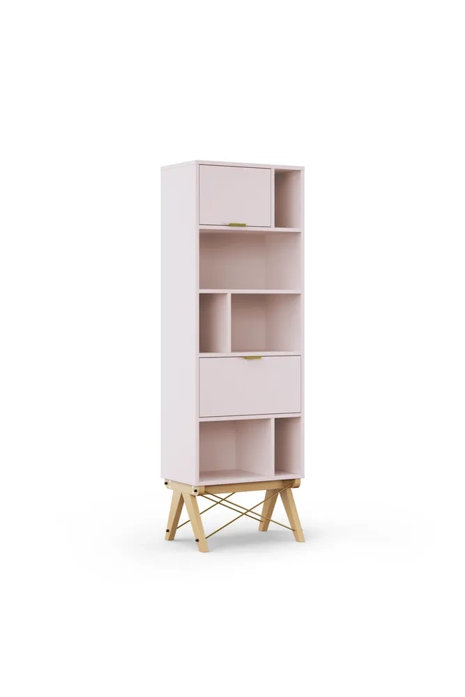 Nóżki regału wykonane zostały z naturalnego drewna: buku, dębu, dębu bielonego lub w wybarwieniu orzecha. Druciki spinające drewniane nóżki nie tylko stanowią element konstrukcyjny, ale także zdobią mebel, dodając mu wyjątkowego charakteru. Jak wszystkie meble z oferty, jest dostępny w szerokiej palecie materiałów i kolorów. Stwórz swój spersonalizowany wymarzony mebel!