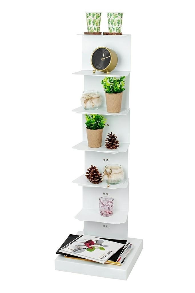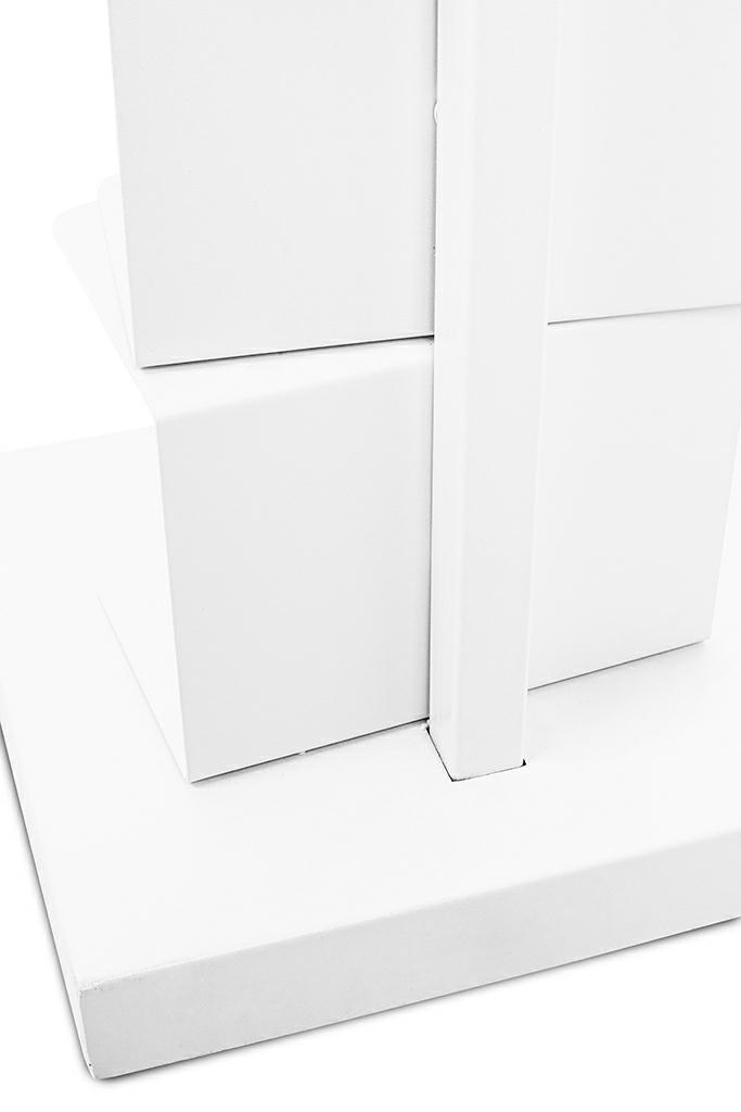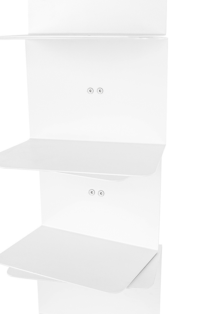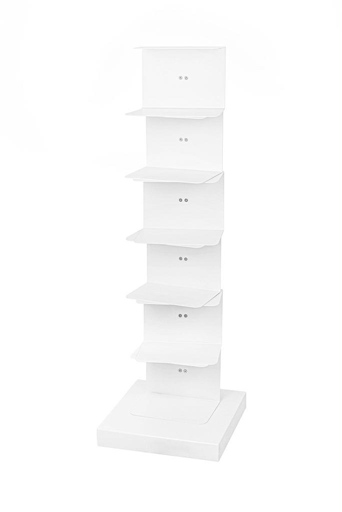 - Regał TIER zrobiono z metalu w kolorze białym. Posiada on sześć obrotowych półek, mocowanych jedna na drugiej. Całość tworzy stabilną konstrukcję na szerokiej metalowej podstawie. Mebel sprawdzi sie w domu i w biurze. Wymiary: wys. 110 cm / szer. 35 cm /