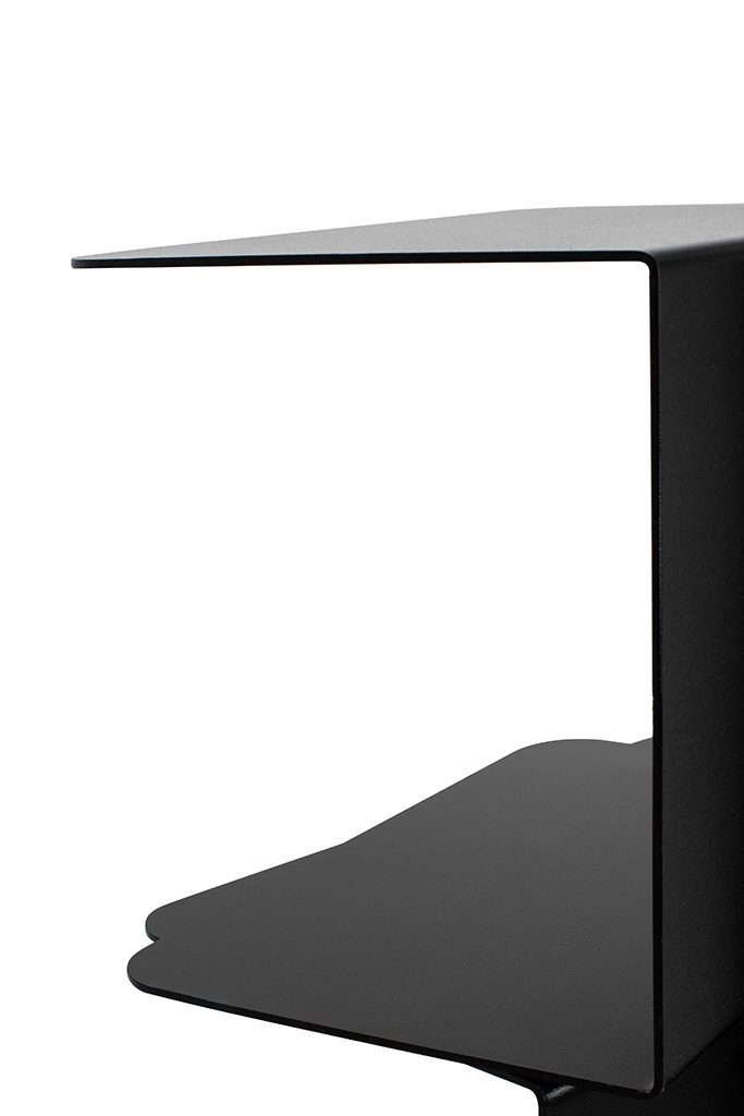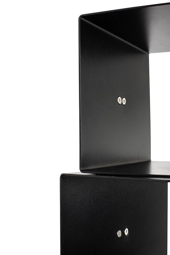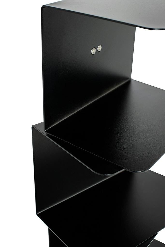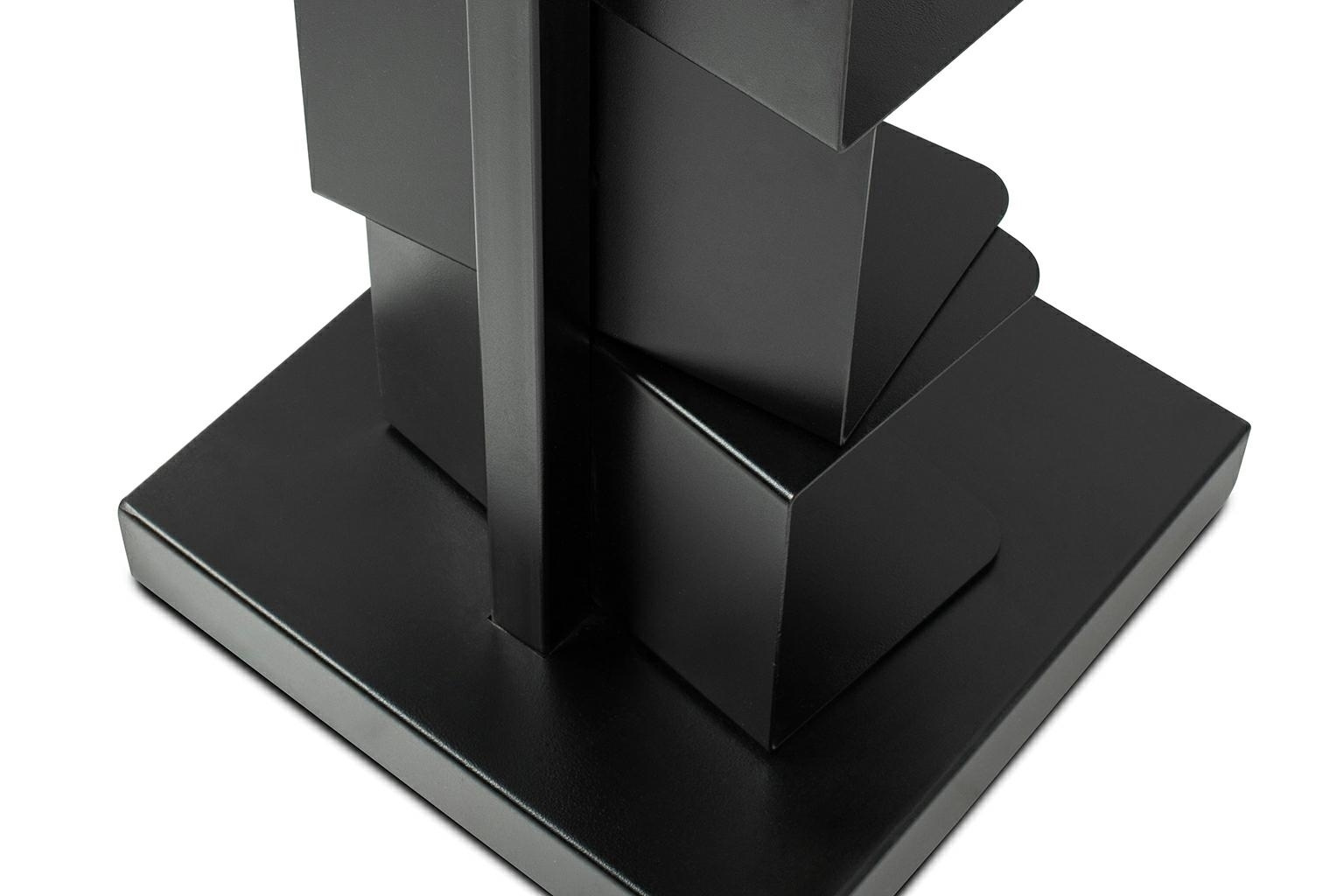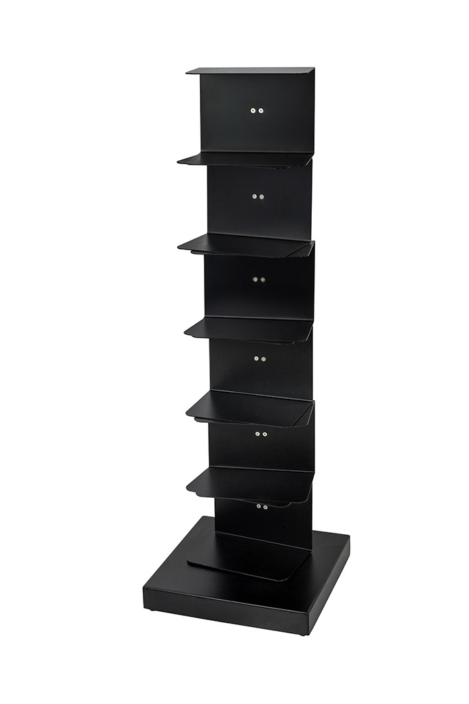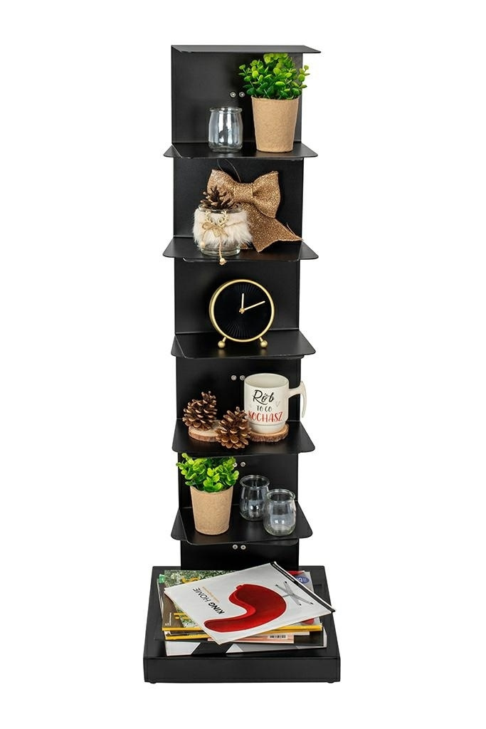 - Regał TIER zrobiono z metalu w kolorze czarnym. Posiada on sześć obrotowych półek, mocowanych jedna na drugiej. Całość tworzy stabilną konstrukcję na szerokiej metalowej podstawie. Mebel sprawdzi sie w domu i w biurze. Wymiary: wys. 110 cm / szer. 35 cm /