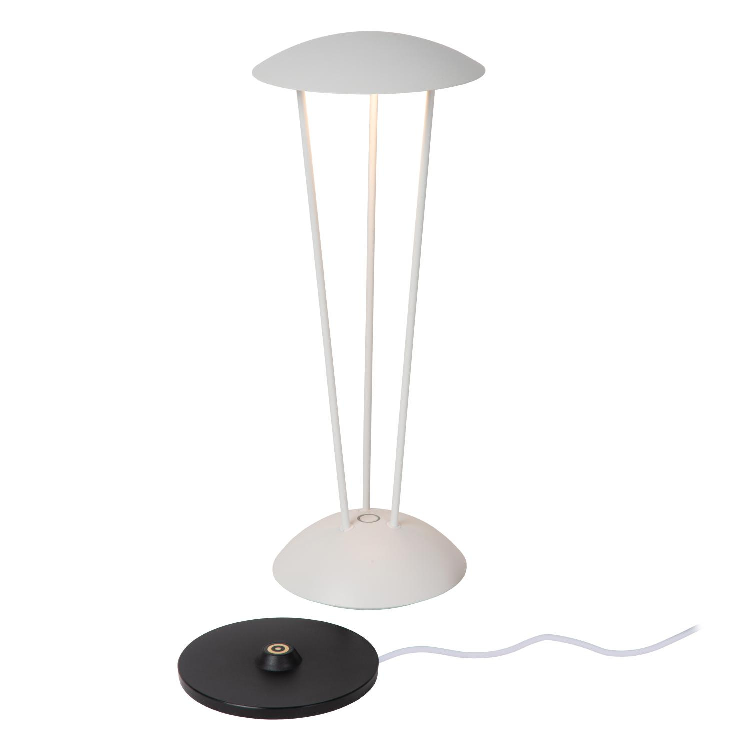 • RENEE - Zewnętrzna akumulatorowa lampka stołowa - fi 12,3 cm - 1x2,2W 2700-3000 K - IP54 - Bezprzewodowa stacja ładująca w zestawie. Kolor biały. Ściemnialna za pośrednictwem funkcji dotykowej na lampie. 3 lata gwarancji.