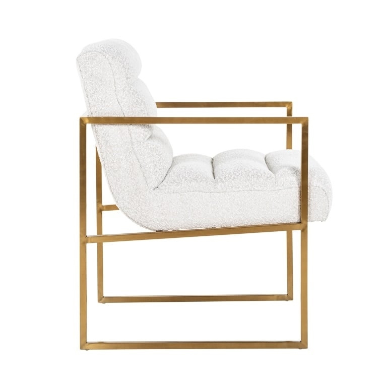 - RICHMOND fotel LIZZY biały, złota podstawa. Przytulny fotel połączony z nowoczesnym szykiem. Jasne siedzisko wykonano z modnej, białej tkaniny Boucle, która ostatnio króluje w salonach wnętrz. Podstawę oraz podłokietniki wykonano z metalu w kolorze szczot