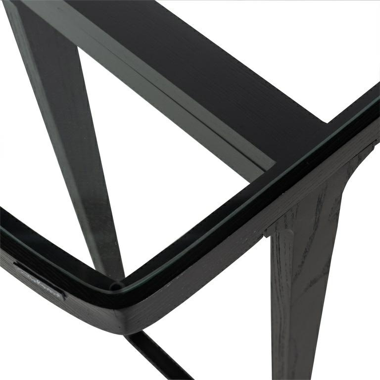 • RICHMOND konsola MONFORT czarny. Całość wykonana jest z czarnego jesionowego forniru, a szklany transparentny blat doda konsoli lekkości i elegancji. Dzięki klasycznej czerni świetnie sprawdzi się w niemal każdym stylu. Kolekcja Monfort pozwoli na spójne