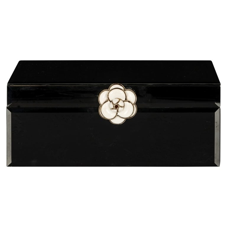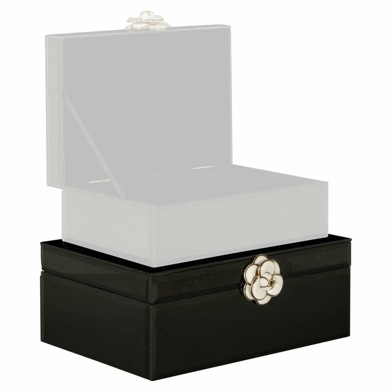 RICHMOND pojemnik na biżuterię VIVY L czarny. Idealne rozwiązanie dla osób poszukujących eleganckiego i luksusowego sposobu przechowywania swojej cennej biżuterii i innych wartościowych rzeczy. Piękne wykonanie z czarnego MDF i szkła. Przy otwarciu można zobaczyć piękną biało-złotą różę, która dodaje delikatności i subtelnej elegancji. Dostępna także mniejsza wersja. Wymiary: wys. 9,5 cm / szer. 25 cm / gł. 19,5 cm Waga netto: 1,5 kg.