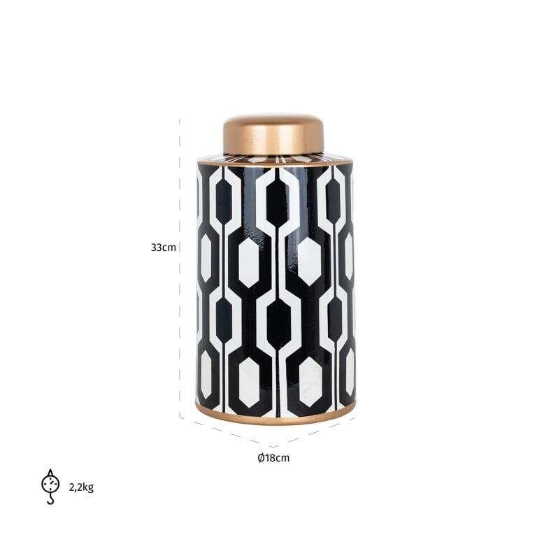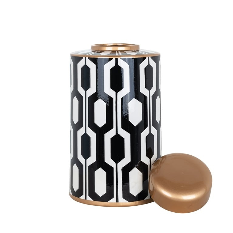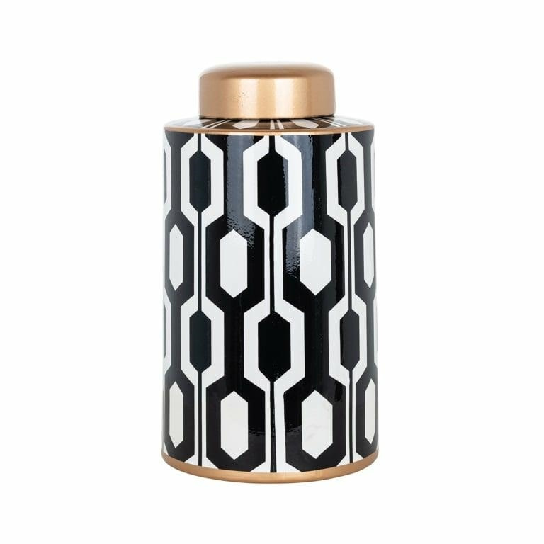 - RICHMOND pojemnik ozdobny/wazon FAYLINN BIG. Faylinn doskonale sprawdzi się jako funkcjonalny pojemnik lub pięny wazon na kwiaty a przy tym będzie niezwykle estetyczną dekoracją. Czarno-białe geometryczne wzory ze złotą pokrywką z ceramiki sprawiają, że e