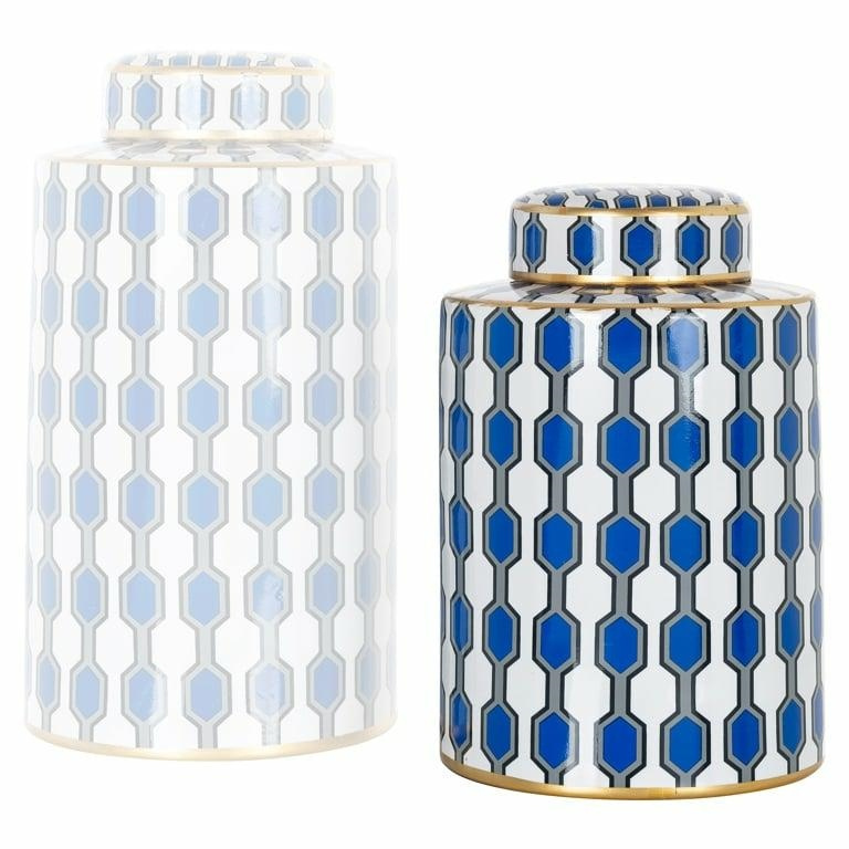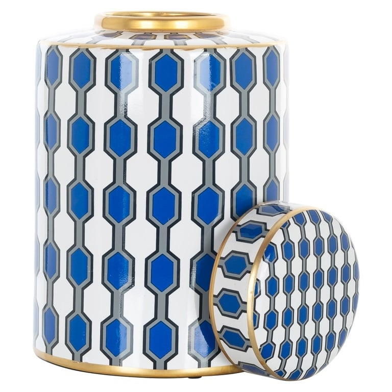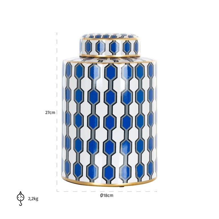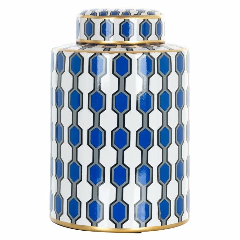 - RICHMOND pojemnik ozdobny/wazon JANICE SMALL. Ceramiczny pojemnik Janice został wzbogacony złotymi brzegami i niebieskimi wzorami. Stylowa i luksusowa dekoracja, będzie idealna do przechowywania akcesorii lub pięknych kwiatów. Dostępna także większa oraz