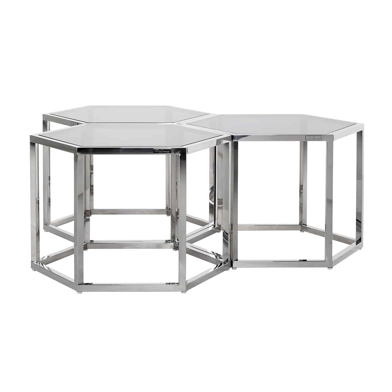 - Stolik kawowy PENTA nawiązuje do stylu art déco. Na zestaw składają się trzy przestrzenne pięciokątne bryły, wykonane ze stali nierdzewnej w kolorze srebrnym. Całość uzupełniają szklane, lekko dymione blaty. Podstawy wyposażono w stopki chroniące powierzc