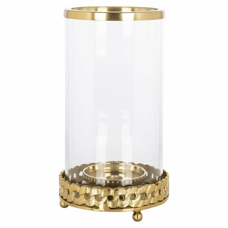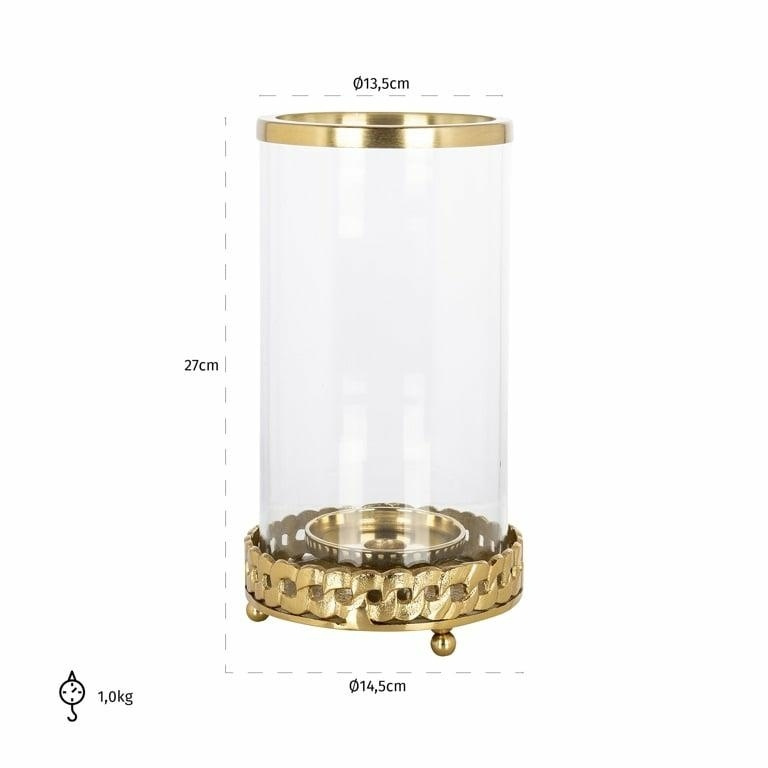 - RICHMOND świecznik MEYLIN złoty. Luksusowy dodatek do wnętrz wykonany z aluminium, wyróżniający się przezroczystym, szklanym cylindrem osadzonym na ozdobnej, złotej podstawie. Podstawa jest przyozdobiona motywem przypominającym łańcuch, co nadaje całości