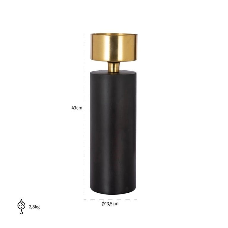 RICHMOND świecznik TESS L czarno-złoty. Ciekawa forma ukryta w intrygującym świeczniku. Tess to wspaniały pomysł na udekorowanie Twojego wnętrza. Całość stworzono w wyniku połączenia drewna i metalu i wykończono w czarno-złotej kolorystyce. Dostępna także mniejsza wersja. Wymiary: wys. 43 cm / szer. 13,5 cm / gł. 13,5 cm Waga netto: 2,8 kg.