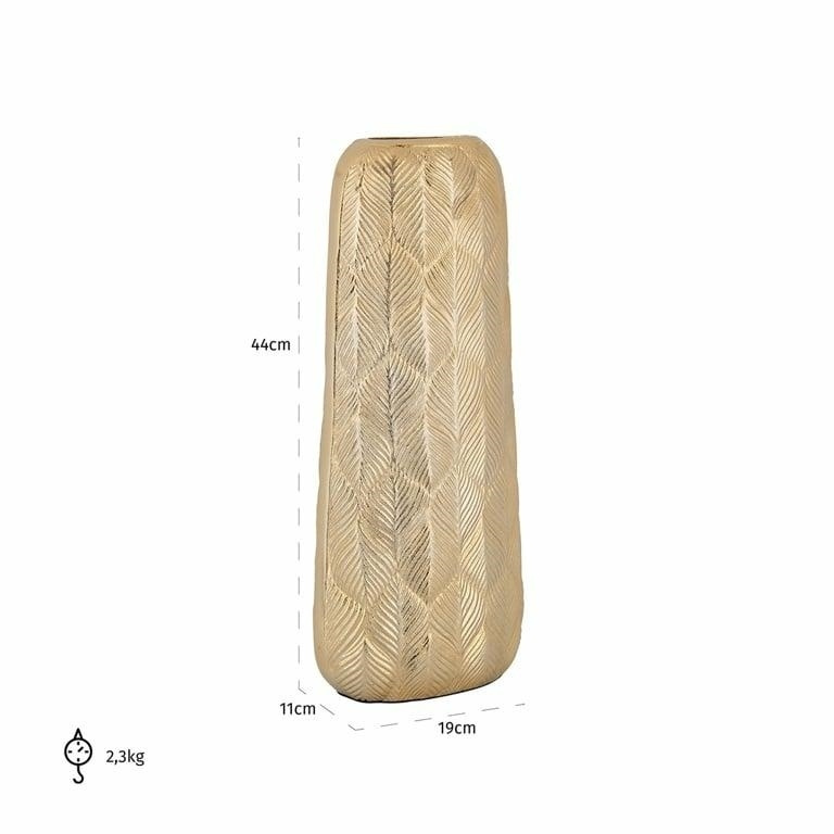 - RICHMOND waza MIRTHE złota. Wazon Mirthe charakteryzuje piękny, szykowny wzór imitujący liście. Całość wykonano z aluminium i wykończono w bogatym złotym kolorze. To unikalna dekoracja, która ozdobi każde wnętrze. Wymiary: wys. 44 cm / szer. 19 cm / gł. 1