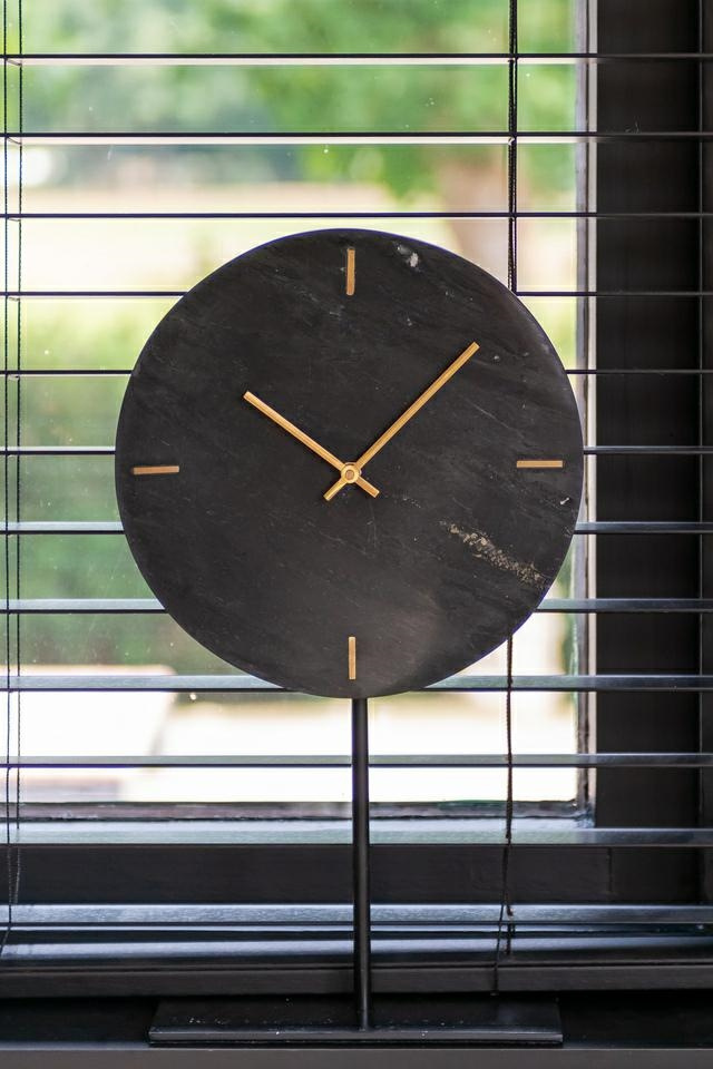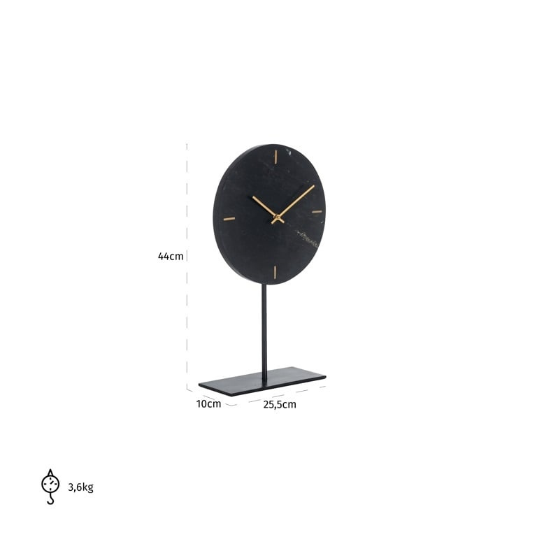 - RICHMOND zegar stołowy BRETT czarny. Brett to elegancki zegar stołowy oparty na czarnej metalowej podstawie. Okrągła tarcza wykonana jest z marmuru i wykończona w czarnej tonacji. Marmur to bardzo trwały rodzaj kamienia o luksusowym i stylowym wyglądzie.