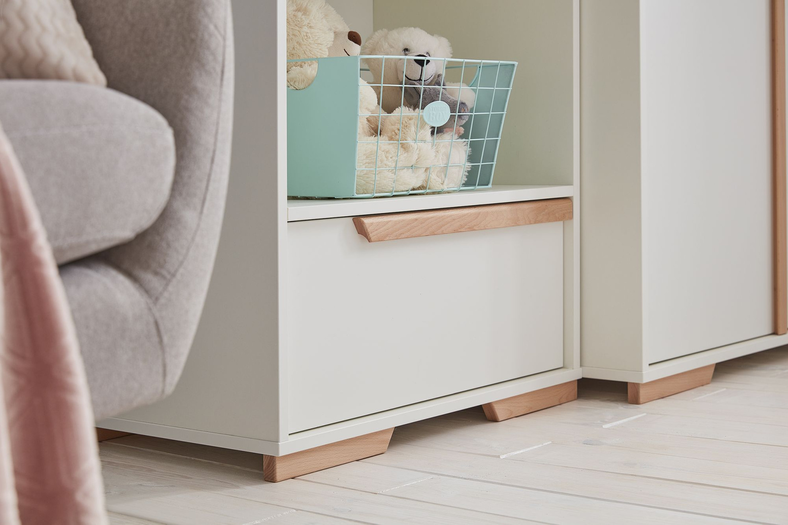 Regał wykonany jest z malowanej płyty MDF, płyty laminowanej (korpus, elementy wewnętrzne) oraz z drewna bukowego (elementy w kolorze drewna). Został pomalowany ekologicznymi farbami wodnymi, dzięki czemu zapewniono mu prawidłowy proces oddychania oraz wyeliminowano czynnik mogący powodować u dzieci alergie. Występuje w kolorze białym i szarym. Pasuje zarówno do pokoiku chłopca, jak i dziewczynki. Produkt do samodzielnego montażu.