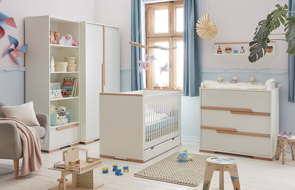 Szafa wykonana jest z malowanej płyty MDF, płyty laminowanej (korpus, elementy wewnętrzne) oraz z drewna bukowego (elementy w kolorze drewna). Komoda została pomalowana ekologicznymi farbami wodnymi, dzięki czemu zapewniono mu prawidłowy proces oddychania. Występuje w kolorze białym i szarym. Pasuje zarówno do pokoiku chłopca, jak i dziewczynki. Produkt do samodzielnego montażu.