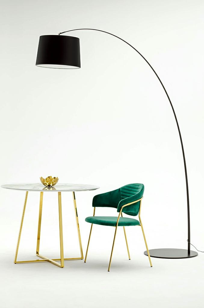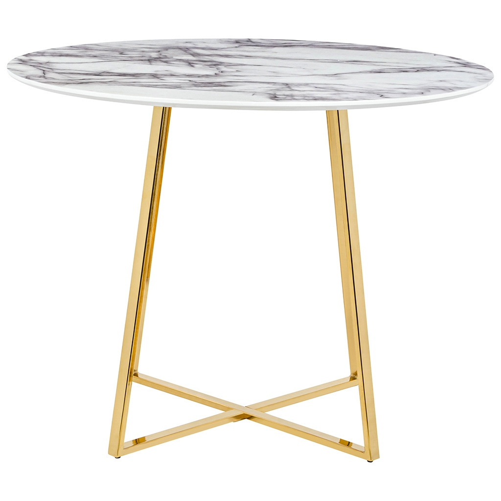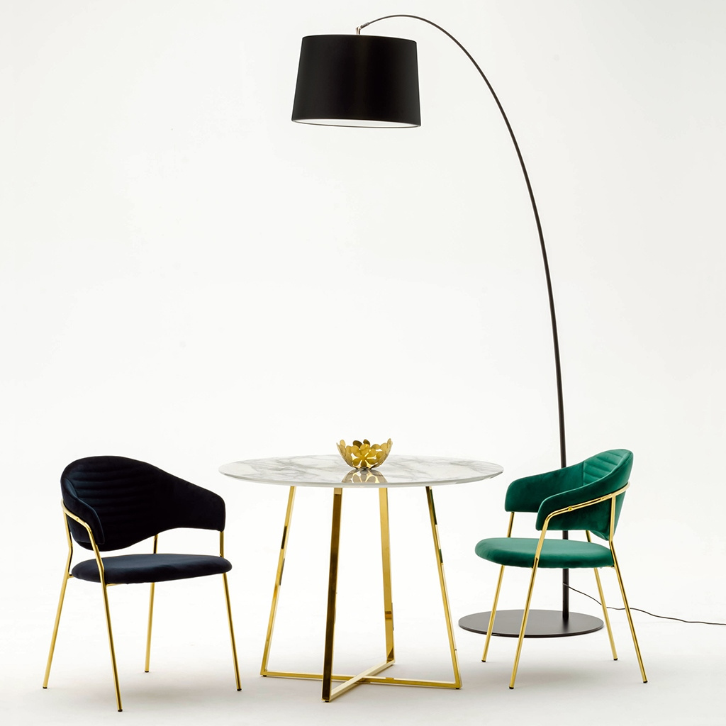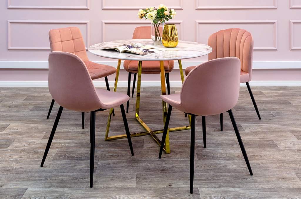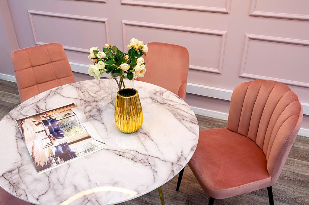 • Stół Carat Okrągły blat wykonany został z MDF-u w okleinie imitującej marmur. Staranie wykonane okleinie z błyszczącego PCV, powoduje że blat wygląda jak prawdziwy marmur. Mocna podstawa zrobiona jest z metalowych poprzeczek w złotym kolorze, Stół Carat d