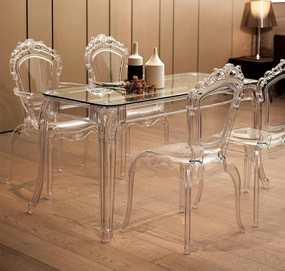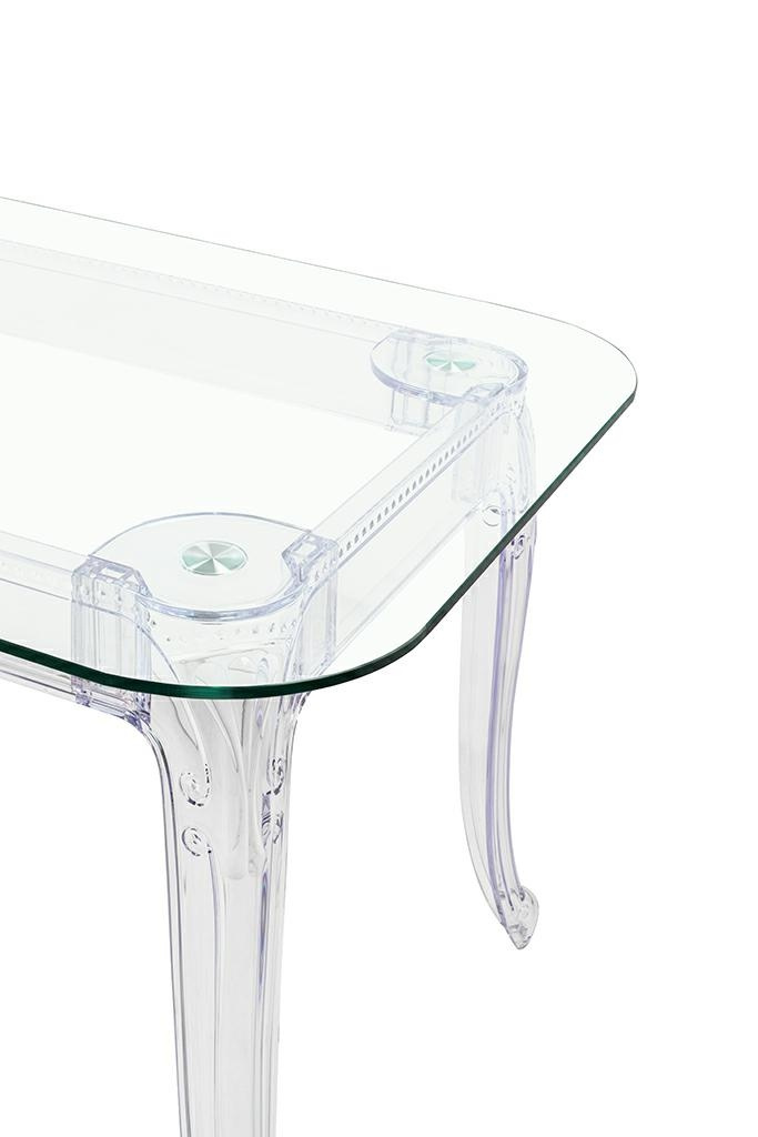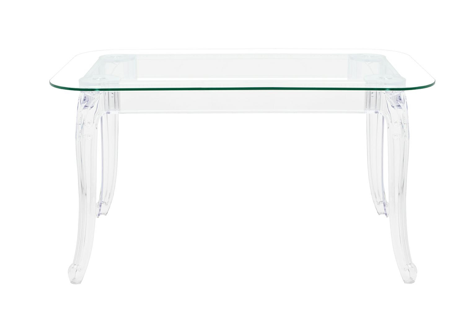 - Stół KING 160 to nowoczesna i szykowna forma w stylu glamour. Nogi wykonane są z poliwęglanu, tworzywa lekkiego, lecz bardzo wytrzymałego. Blat stołu zrobiono z grubego hartowanego szkła. Całość nie przytłacza wnętrza, stół jest praktycznie niewidoczny, d