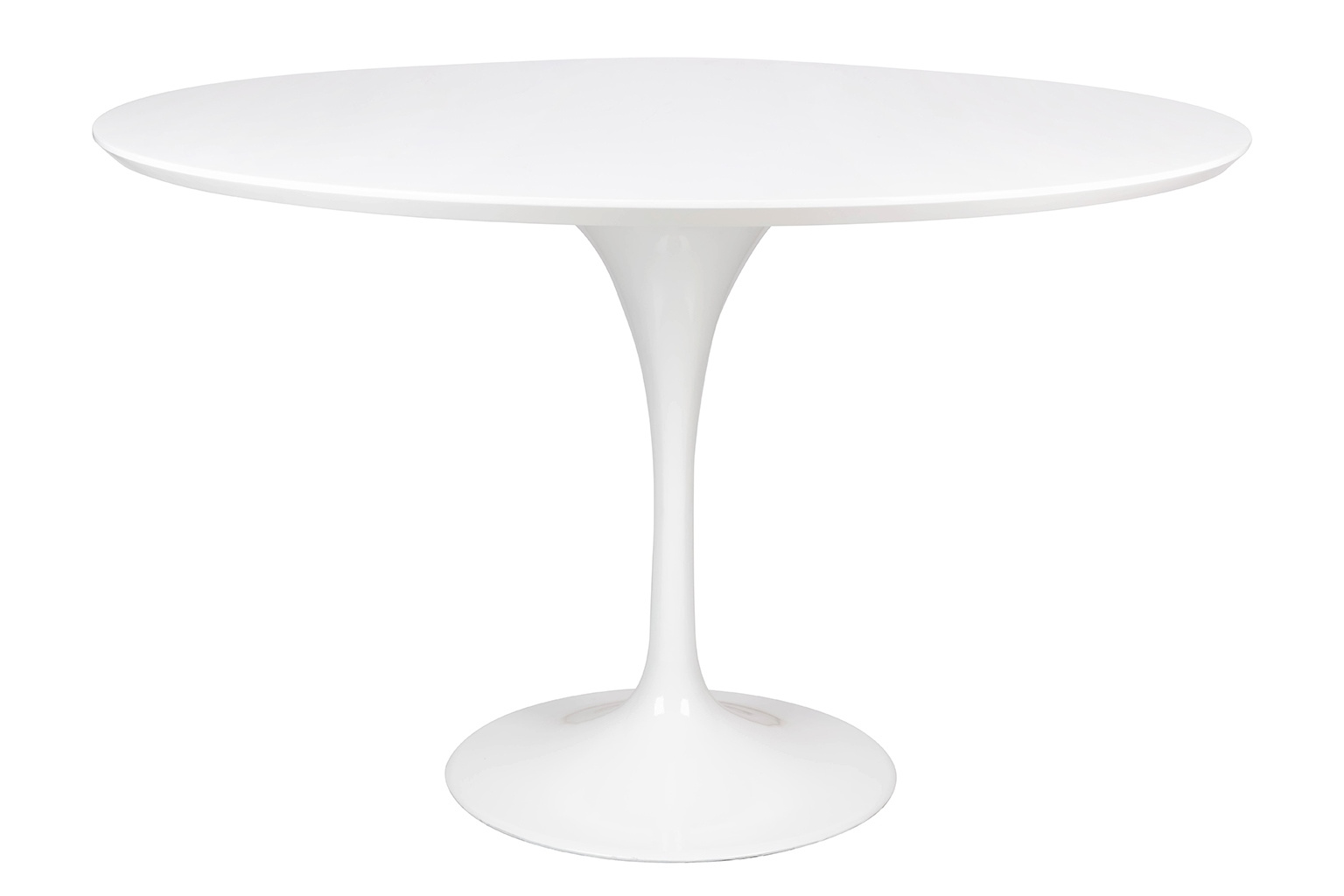 - Okrągły stół Tulip Premium. Blat o średnicy 120 cm, wykonany z MDF-u w kolorze biały połysk. Noga wykonana z metalu lakierowanego proszkowo na kolor biały połysk. Dopełnieniem stołu, są fotele i krzesła z kolekcji Tulip. Całość tworzy elegancki i ekskluzy