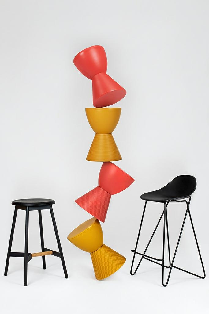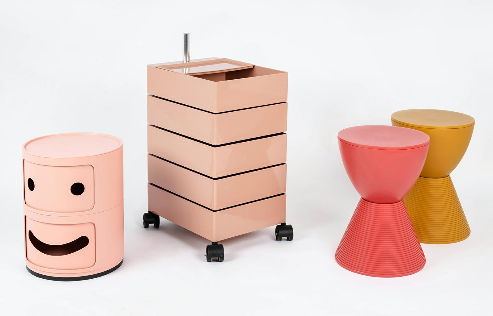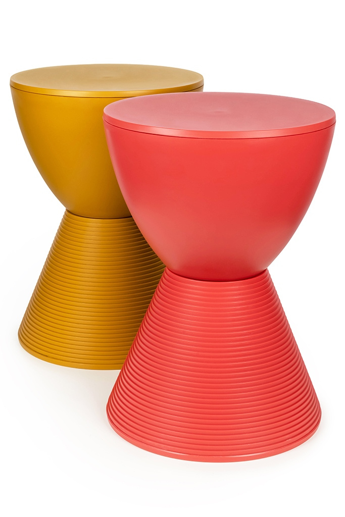 - Designerski stołek Tamburo. W całości wykonany został z polipropylenu w przyjemnym pastelowym kolorze Imbiru. Dzięki swojej konstrukcji, stołek może być używany z dwóch stron. Pod każdym siedziskiem jest miejsce do przechowywania drobiazgów. Stołek może s