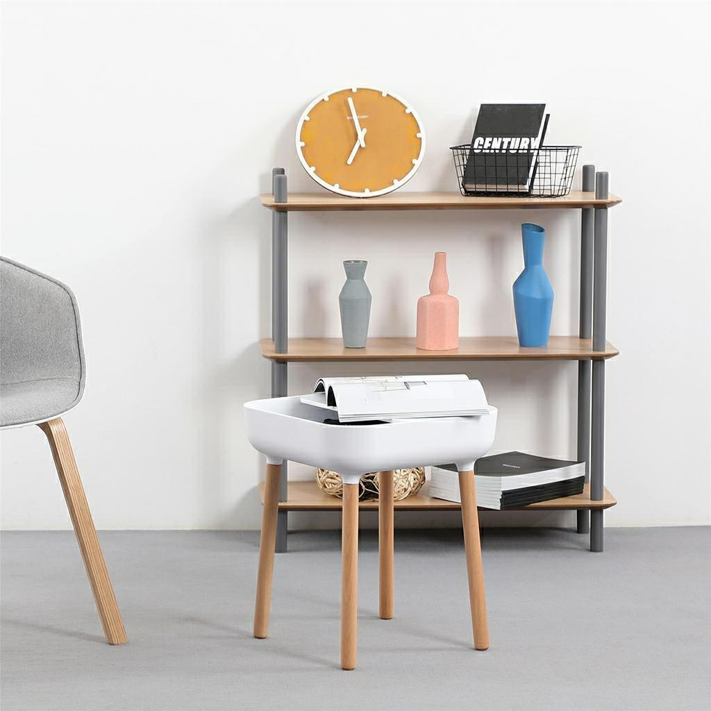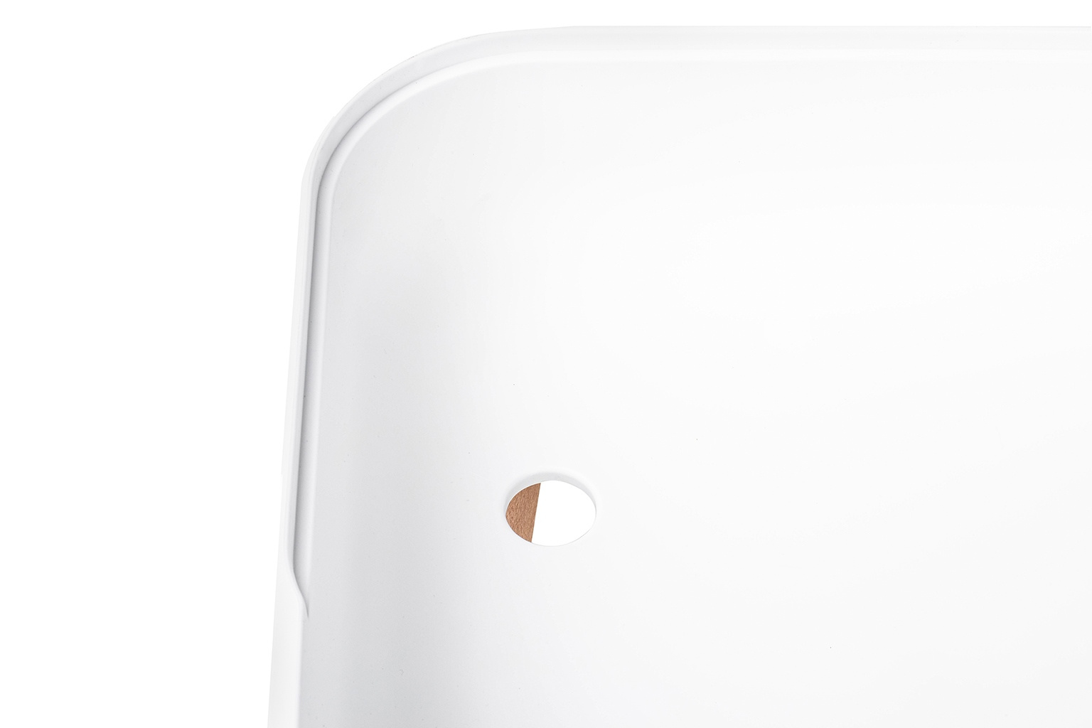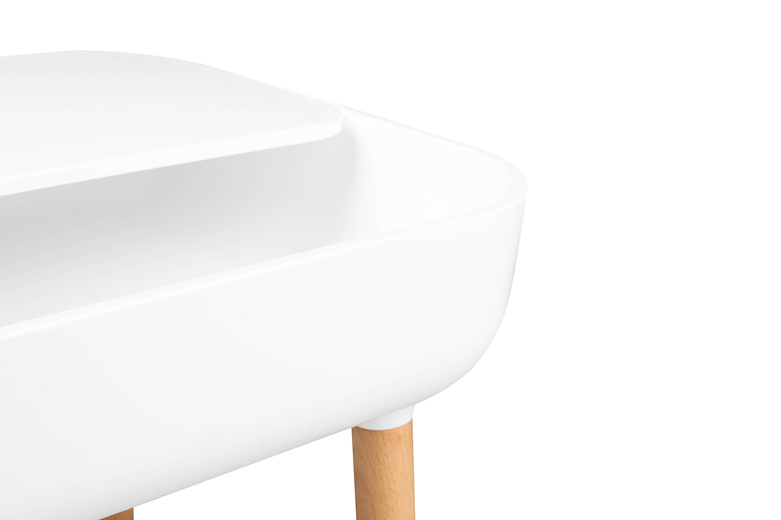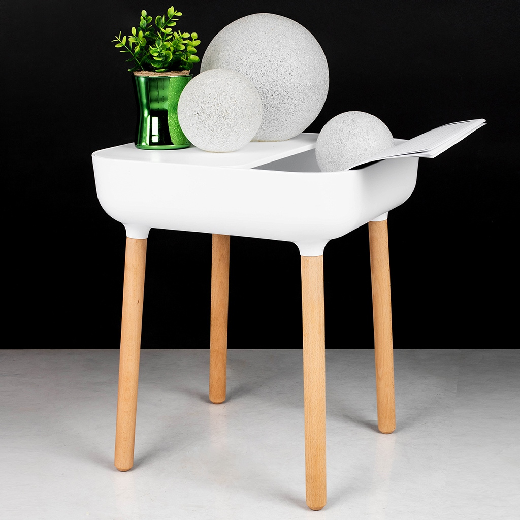 - Stolik BOWER biały. Blat z praktyczną półką wykonany został z polipropylenu w kolorze białym z dodatkowym miejscem na przeprowadzenie przewodu, co znacznie ułatwia organizację. Nogi z drewna bukowego sprawiają, że stolik świetnie odnajdzie się w stylu ska