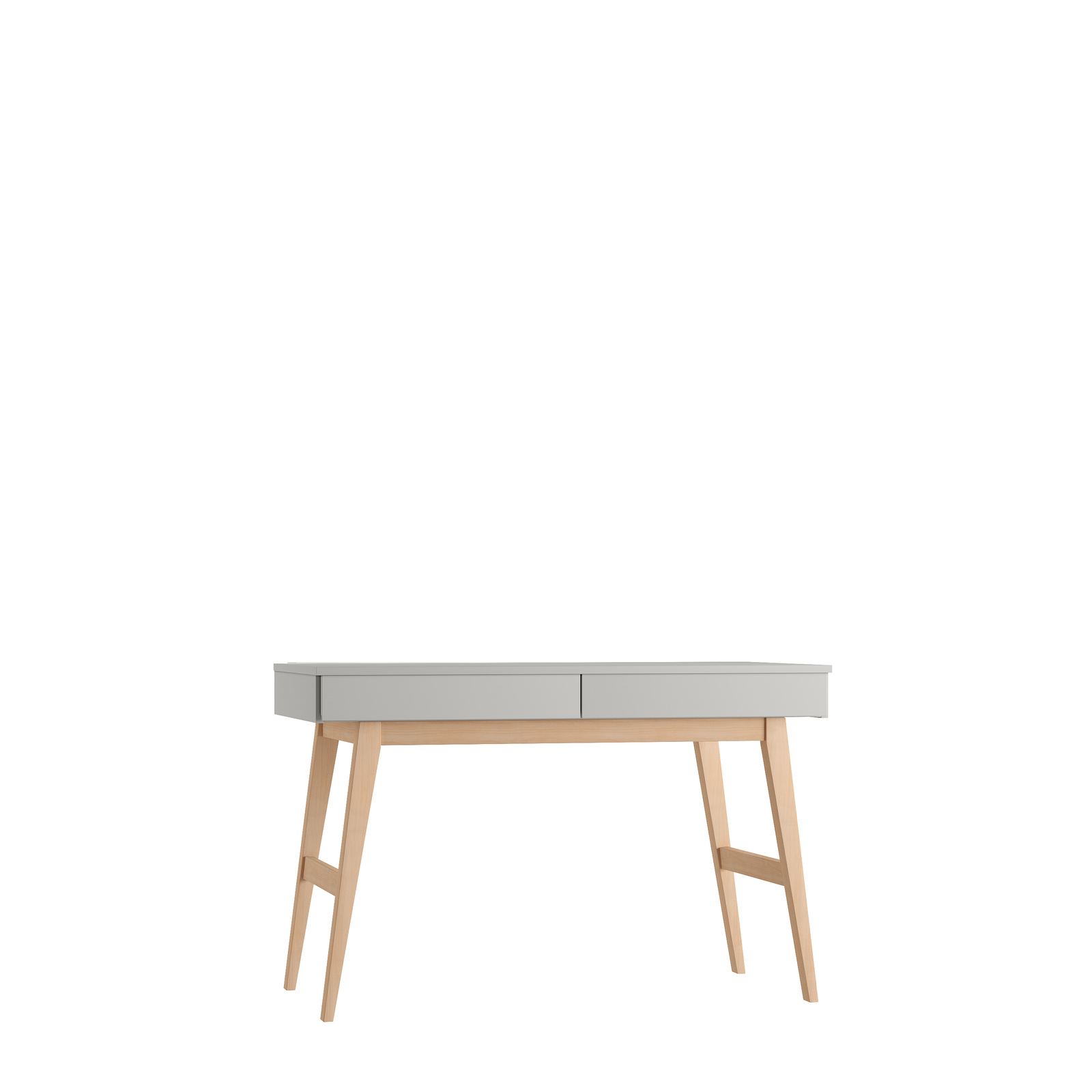 Biurko wykonane jest z malowanej płyty MDF, płyty laminowanej (korpus, elementy wewnętrzne) oraz z litego drewna bukowego (nóżki). Biurko zostało pomalowane bezpiecznymi, atestowanymi farbami, zgodnymi z normą EN 71-2. Posiada 2 szuflady, wyposażone w prowadnice kulkowe z hamulcem i samodomykiem. Blat biurka znajduje sie na wysokości 78,4 cm. do biurka można dokupić organizer - wtedy wysokość całkowita wynosi 94,1 cm. Występuje w kolorze białym oraz szarym. Produkt do samodzielnego montażu.