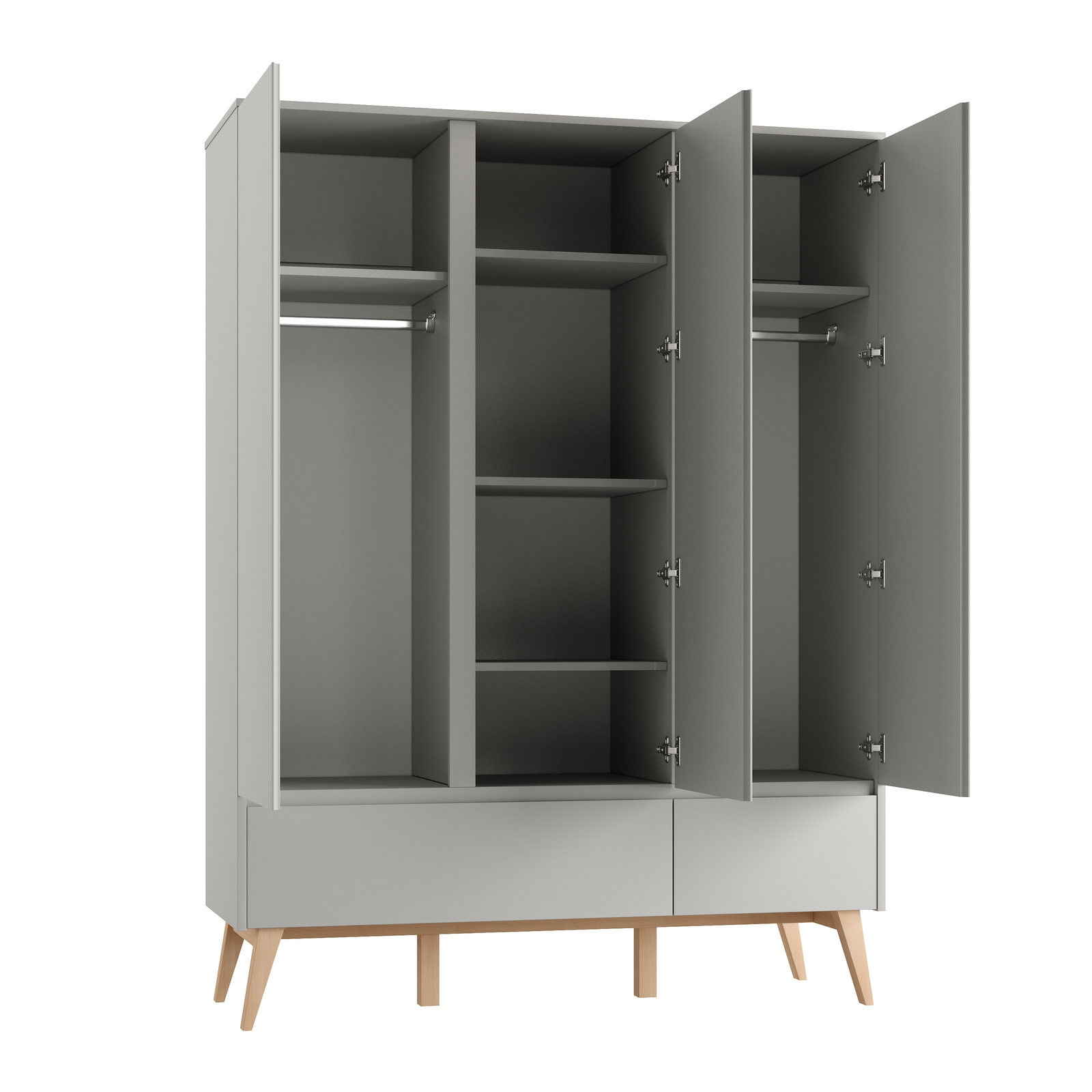 Pojemna szafa 3-drzwiowa z kolekcji Swing z systemem cichego zamykania wysokiej jakości. Wewnątrz 2 przegrody pionowe oraz różne możliwości aranżacji wnętrza szafy – 3 półki w środkowej części oraz np. 1 półka i drążek z jednej strony i 1 półka i drążek na ubrania z drugiej strony – w standardzie 3 półki do środkowej części oraz 2 półki i 2 drążki na ubrania do części zewnętrznych – możliwość dokupienia dodatkowych półek (maksymalnie 4 sztuki). Środkowe drzwi mogą zostać zamontowane zarówno z lewej jak i z prawej strony.