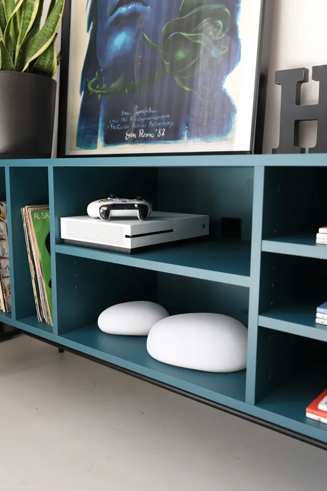 Tył szafki RTV został przystosowany do takich elementów jak listwy przypodłogowe, kontakty czy kable sprzętów audio. Stelaż szafki RTV został lekko cofnięty, a tył szafki posiada specjalnie zaprojektowane przez nas wypłycenie i cofnięte plecy panelowe umożliwiające przeprowadzenie kabli, wtyczek oraz bezpieczne ukrycie ich za plecami mebla.