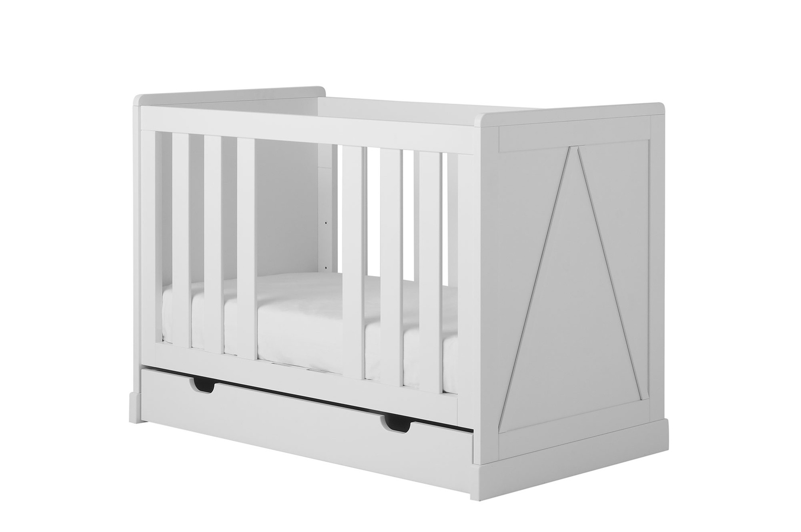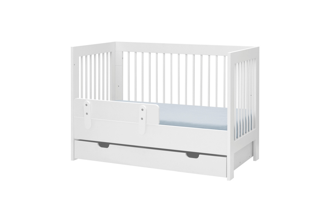 Szuflada wykonana jest z płyty meblowej oraz płyty MDF (fronty). Została pomalowana ekologicznymi farbami wodnymi. Występuje w kolorze białym i szarym. Pasuje zarówno do łóżeczka dla chłopca, jak i dziewczynki. Produkt do samodzielnego montażu.