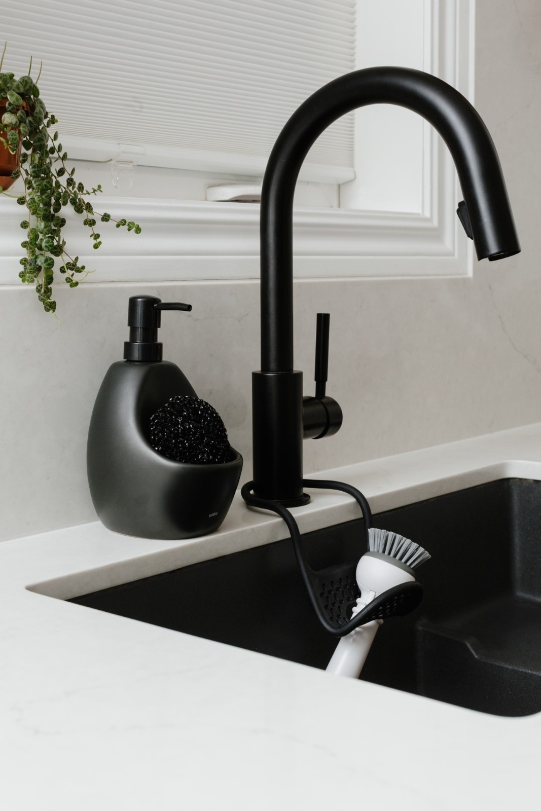 - UMBRA dozownik do mydła JOEY czarny. Elegancki i nowoczesny dozownik będzie doskonałym dodatkiem do każdego blatu w kuchni lub łazience. Wbudowany w dozownik, pojemnik pozwoli nam na przechowywanie niezbędnych akcesoriów, takich jak gąbka. Jego ceramiczna