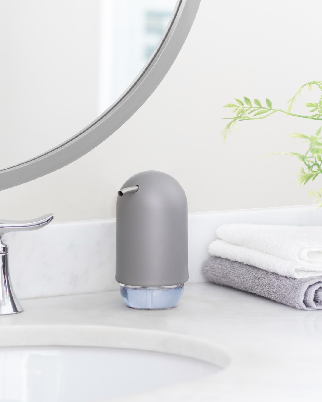 - Dozownik do mydła Touch został wykonany z tworzywa sztucznego o matowej powierzchni połączonego z przezroczystym materiałem. Tak, jak pozostałe elementy serii Touch do której należy, opiera się na prostej formie. Nieskomplikowany projekt dostępny jest w s