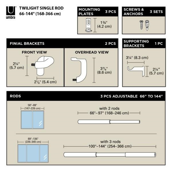 • UMBRA karnisz TWILIGHT 168 - 365 cm srebrny Idealne rozwiązanie do zaciemniania pomieszczeń o długości regulowanej od 168 do 365 cm. Dzięki zakrzywionej konstrukcji na końcach, zasłony ściśle przylegają do ściany, blokując światło i zapewniając większą pr