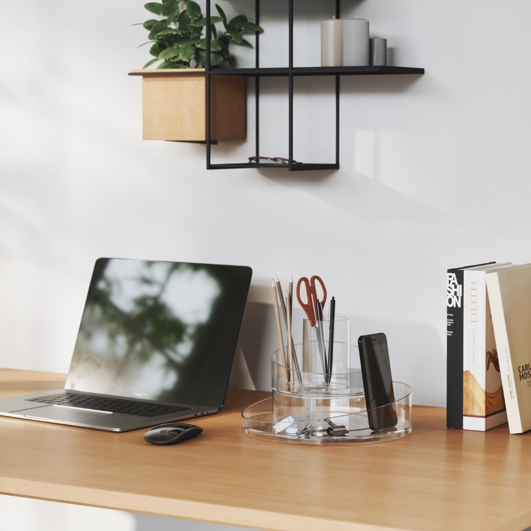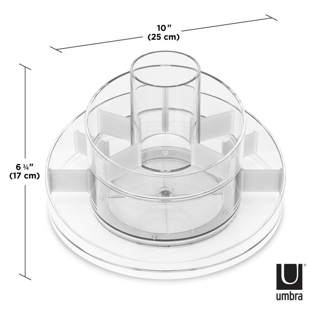 - UMBRA organizer do kosmetyków CASCADA - przezroczysty. Jest to organizer, który z pewnością przykuje uwagę Twoich znajomych, zapewniając jednocześnie miejsce do przechowywania. To organizer do makijażu z obrotową podstawą, wyposażoną w dwie oddzielne prze