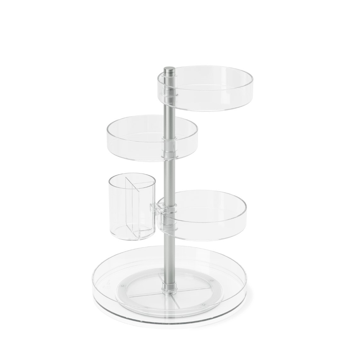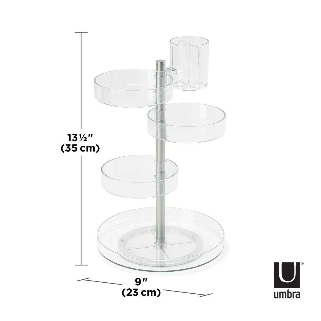 - UMBRA organizer kosmetyczny PIROUETTE - przezroczysty / niklowany. Pozbądź się bałaganu i porządkuj swoje codzienne rzeczy z organizerem Pirouette. Posiada wiele przegródek, które z łatwością obracają się o 360 stopni. Ma duża pojemność i zajmuje niewiele