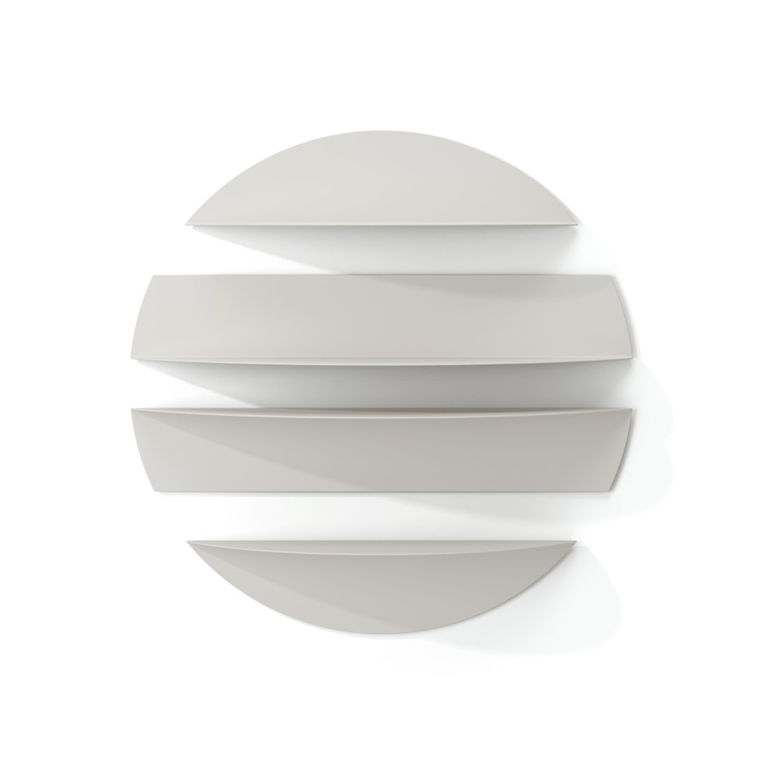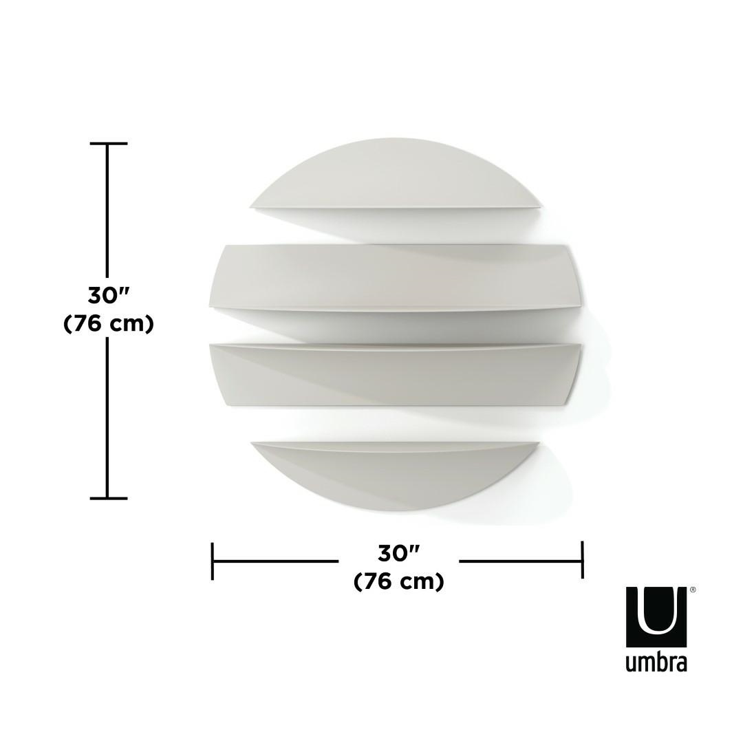 - Półki ścienne Umbra Solis. Zestaw czterech wyjątkowych półek ściennych jest wykonany z wygiętego metalu i może być używany razem, aby stworzyć przyciągającą wzrok ekspozycję ścienną, która służy również jako miejsce do przechowywania. Składa się z dwóch d