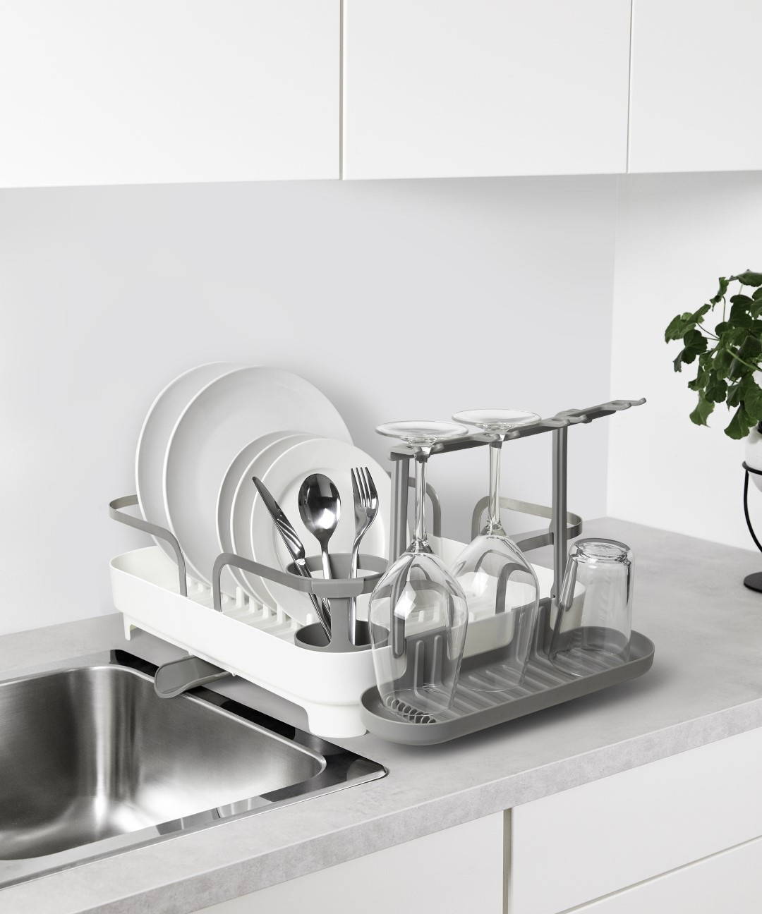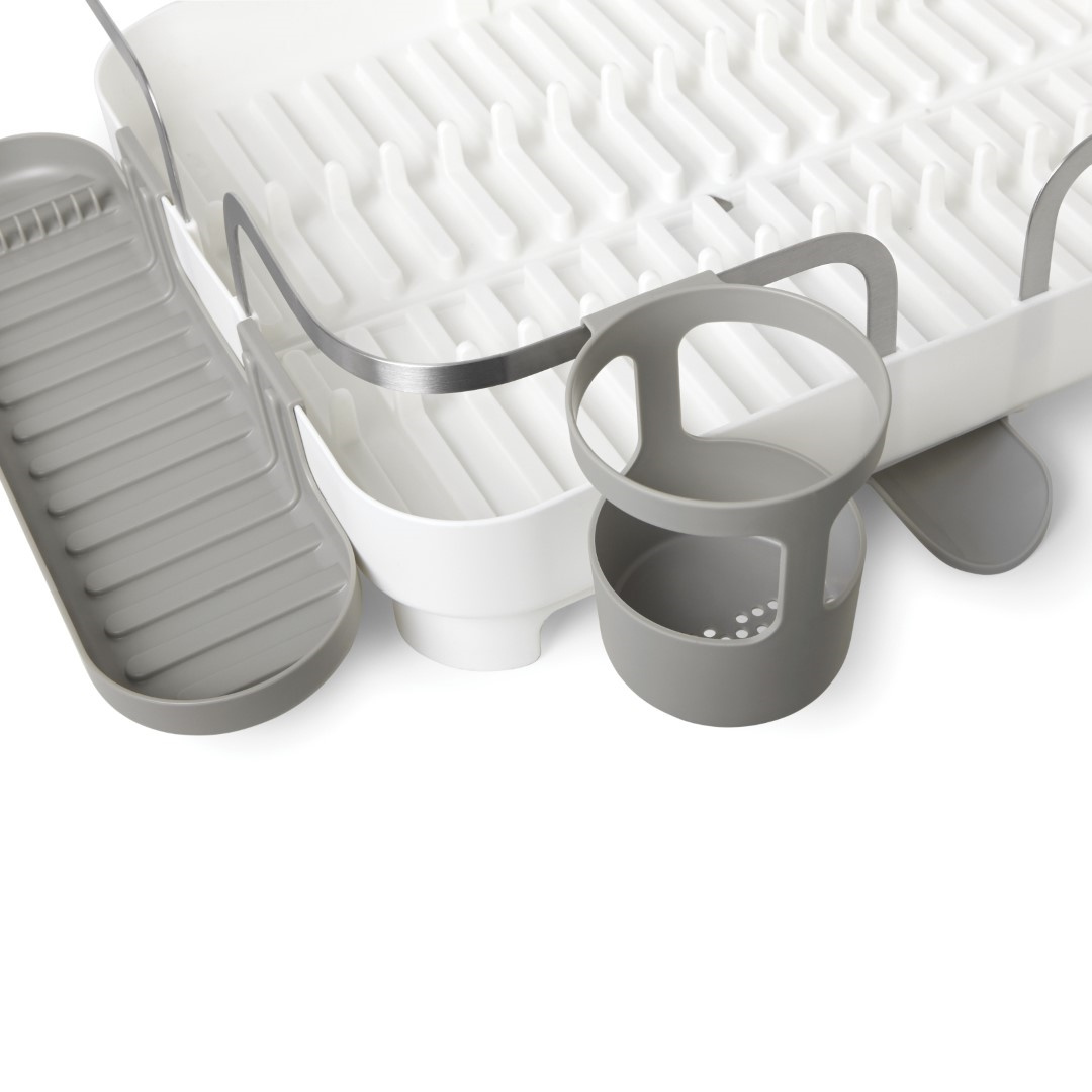 - UMBRA suszarka do naczyń HOLSTER w kolorze białym. Ta suszarka została wykonana z formowanego plastiku i ma ramę ze stali nierdzewnej, dzięki czemu jest wytrzymała i łatwy do czyszczenia. Może pomieścić do pietnastu talerzy, posiada również schowek na prz